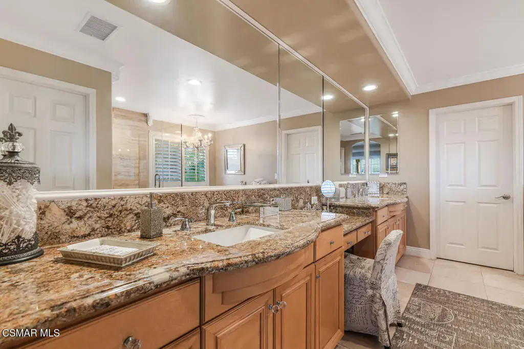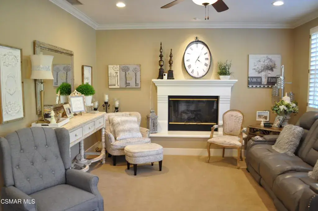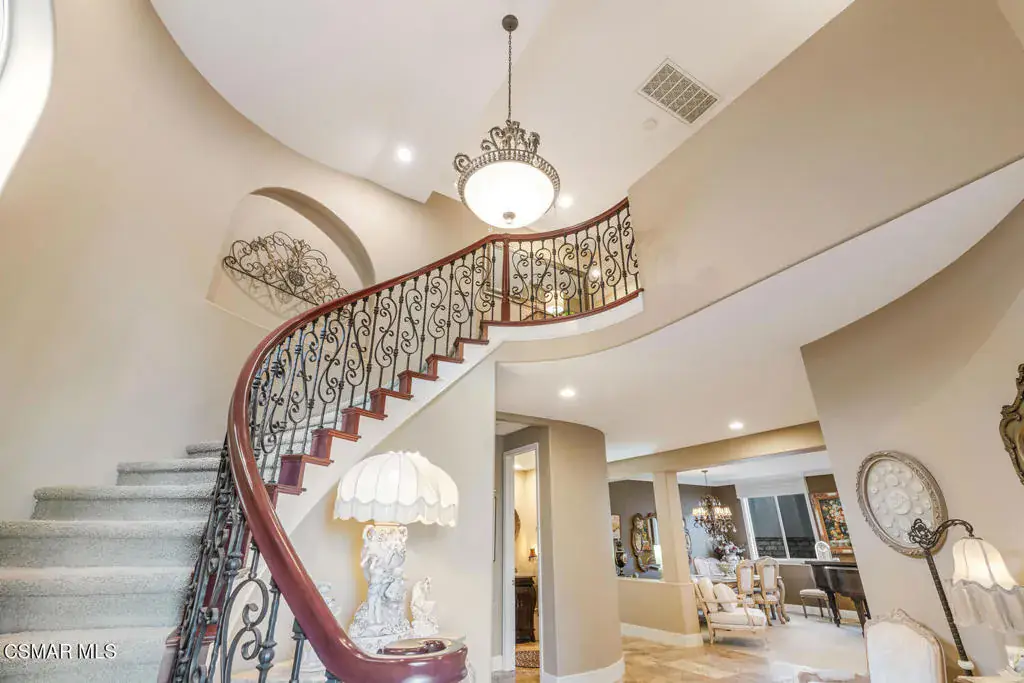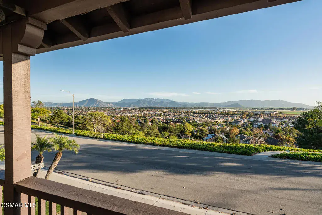 Gorgeous home with breathtaking views located in the prestigious Vina Del Mar community of Spanish Hills in Camarillo.Upon entering, you are welcomed by elegant etched glass doors and a grand foyer with soaring ceilings, setting the tone for this impressive residence. The entry flows seamlessly into the formal living room with a fireplace and an elegant formal dining room, perfect for entertaining.The stunning kitchen is a chef’s delight, featuring stainless steel appliances, granite countertops, and beautifully custom-crafted cabinetry. A spacious center island with a sink and bar seating anchors the space, making it ideal for both everyday living and gatherings. Adjacent to the kitchen, the inviting family room offers a cozy raised-hearth fireplace and plantation shutters, creating a warm and comfortable atmosphere.The private backyard is an entertainer’s dream, showcasing a lush grassy lawn, a tranquil fountain, and a beautifully designed custom hardscape patio–perfect for relaxing, barbecuing, or hosting guests.A convenient downstairs bedroom and full bathroom with a walk-in shower provide an ideal space for guests or multigenerational living. The home also includes a direct-access, three-car attached garage with individual automatic openers.Upstairs, the luxurious primary suite features dual vanity sinks, a separate soaking tub and shower, and two spacious walk-in closets. Step out onto the expansive balcony overlooking the front yard and take in the awe-inspiring mountain and city light views. Two additional secondary bedrooms share a dual-sink bathroom, and a generously sized laundry room offers a sink and ample cabinet space.This elegant home has been impeccably maintained and thoughtfully upgraded throughout. The front yard boasts exceptional landscaping and a custom-finished driveway, creating striking curb appeal complemented by truly jaw-dropping views.Residents of this sought-after neighborhood enjoy close proximity to Spanish Hills Country Club and Golf Course, public tennis courts, Springville Dog Park, Camarillo Airport, world-class shopping at Camarillo Premium Outlets, Old Town Camarillo, California State University Channel Islands (CSUCI), a wide variety of dining options, and convenient freeway access.This stunning turnkey home is move-in ready and offers the perfect blend of luxury, comfort, and location–ideal for you and your family.