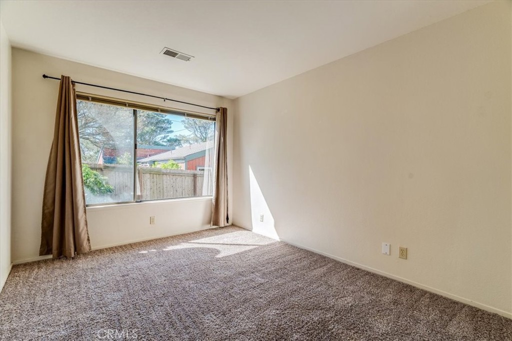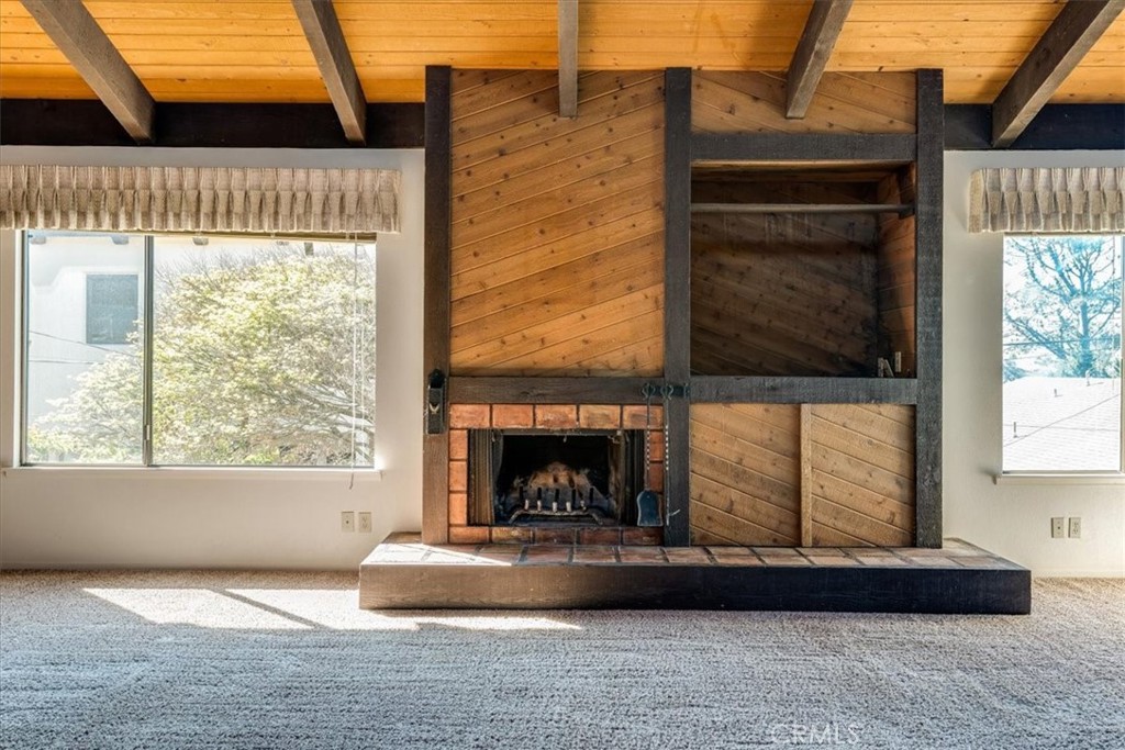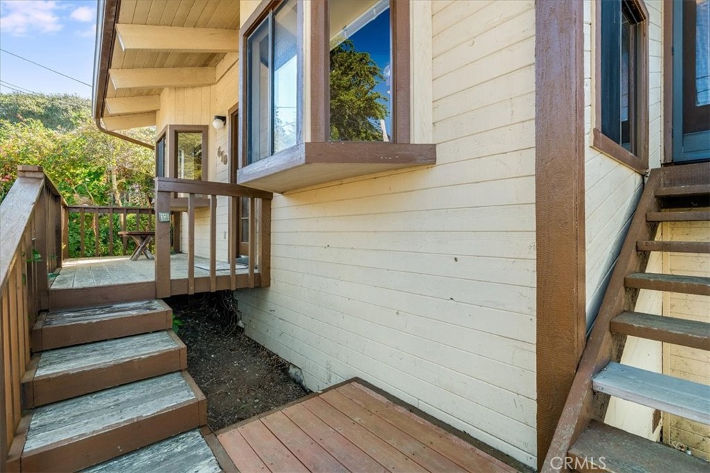Located in the desirable Happy Hill neighborhood of Cambria, this property offers a prime coastal setting just minutes from Moonstone Beach, scenic walking trails, and the charming West Village with its inviting shops and restaurants. From the moment you enter, the home presents an open and airy feel, highlighted by a vaulted wood ceiling family room with a wood-burning fireplace that creates a warm and inviting focal point. A convenient half bath is located just off this main living area. Adjacent to the family room is an enclosed patio featuring terra-cotta tile and ocean views, providing a comfortable space to relax and take in the coastal setting. Downstairs, you will find two bedrooms and a full bathroom, with one bedroom offering direct access to the rear yard. This property presents a great opportunity for a buyer to update and customize to their own style while enjoying an exceptional location on Happy Hill.