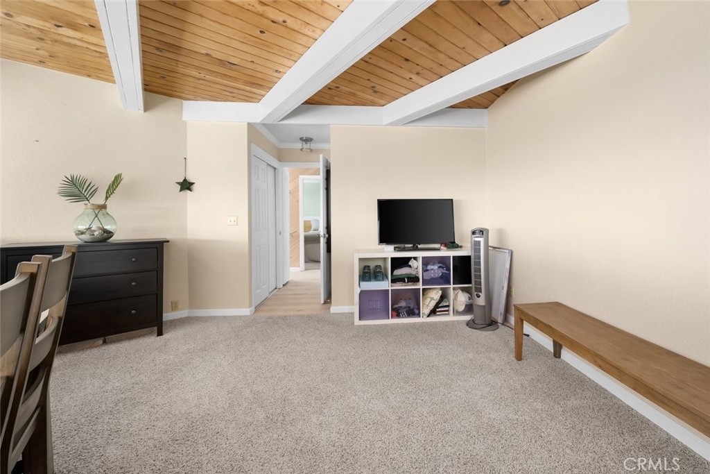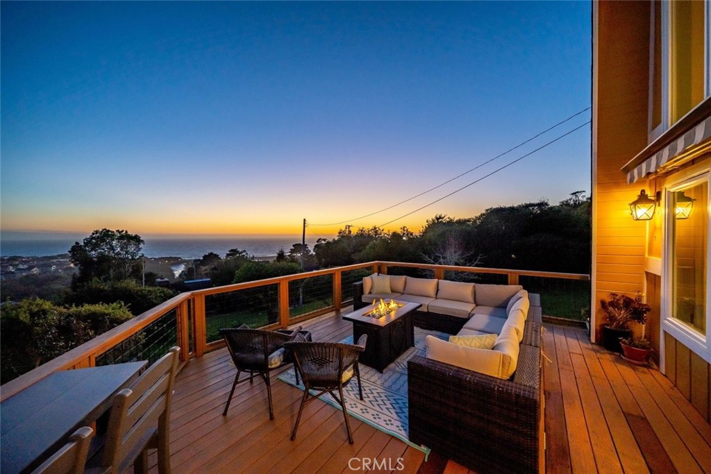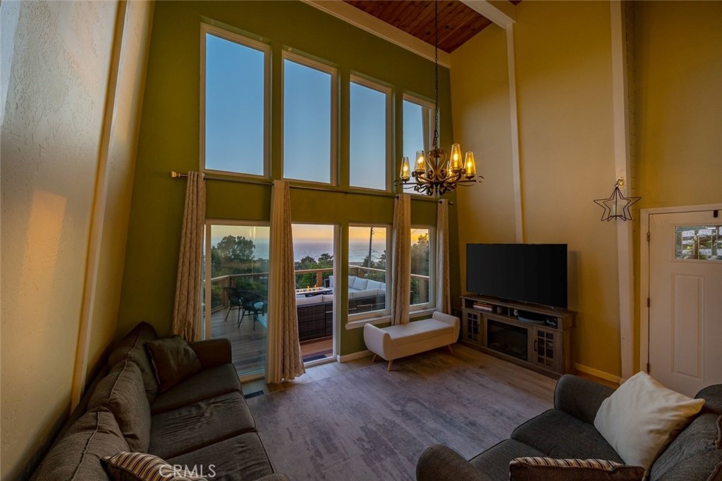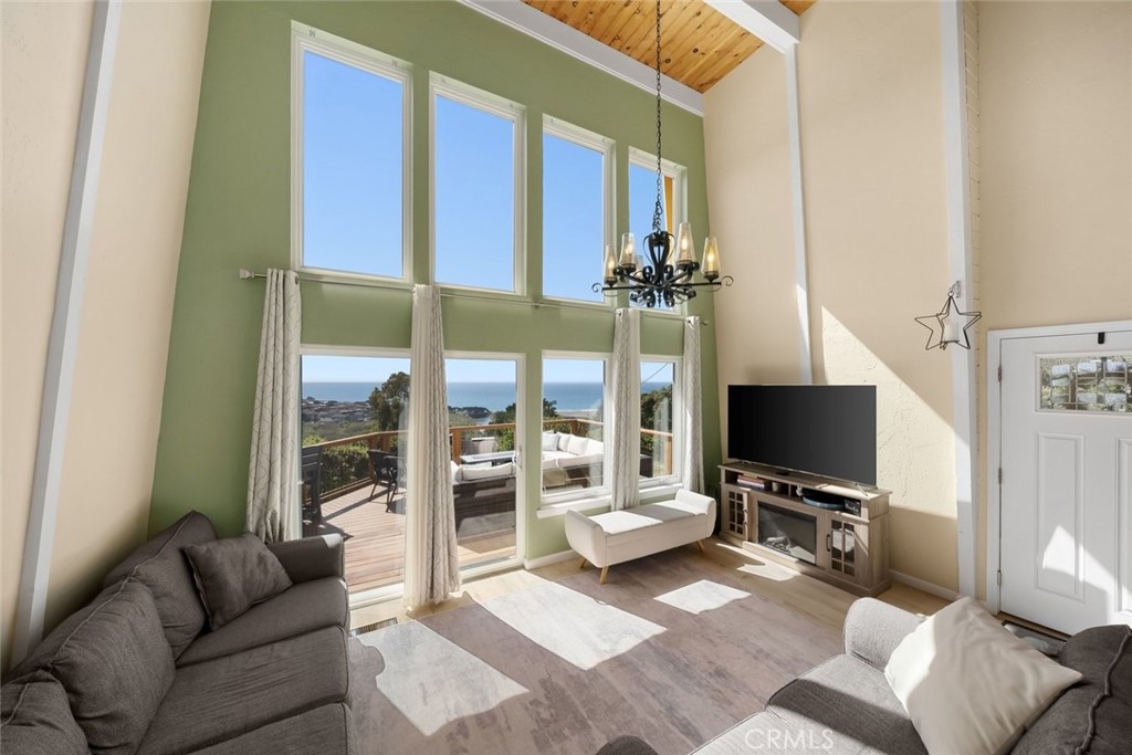 The dramatic living room—with nearly 18-foot ceilings, a cozy fireplace, and expansive windows—opens to a large view deck that truly extends the living space. It’s an ideal setting for morning coffee, outdoor dining, or simply taking in the whitewater views of Moonstone Beach and the Santa Rosa Creek estuary.