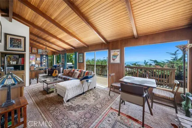 Dreaming of a rustic hideaway where ocean views and forested hills meet? Residing on one of Cambria’s most sought-after streets, this shingle-clad cottage feels like a cabin retreat with coastal beauty beyond every window! Inside, vaulted wood ceilings and a classic brick fireplace create a warm atmosphere, while wide picture windows frame sweeping vistas of sea and sky. A little care is needed to bring this gem to its full potential.
