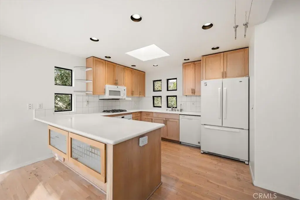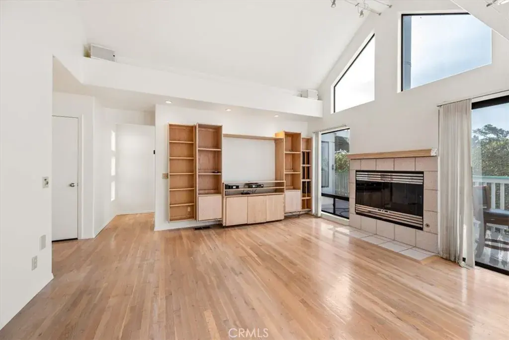 The main living level is upstairs, designed to capture the views and sunshine. Vaulted ceilings, expansive windows, and custom lighting create an airy, uplifting atmosphere throughout the living and kitchen area. Cozy up by the fireplace, enjoy the built-in shelving and cabinetry, or step outside to the view deck to soak in the sweeping ocean vistas and treetop scenery.