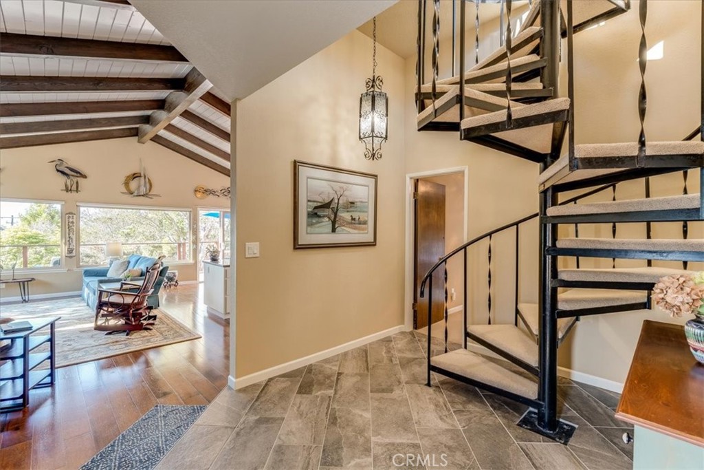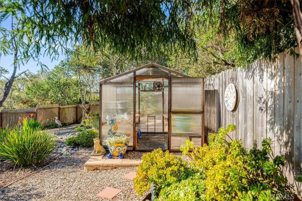 A spiral staircase leads to a unique upper lookout with 360-degree views of the Santa Lucia Mountains and the Pacific Ocean. The property also includes a greenhouse for gardening enthusiasts and a hot tub for relaxing evenings under the stars. Artistic touches throughout the home, including handcrafted fireplace mantel details and custom light globes created by artists, add warmth and character. Very well maintained and move-in ready, this special property offers comfort, views, and a distinctive coastal lifestyle.