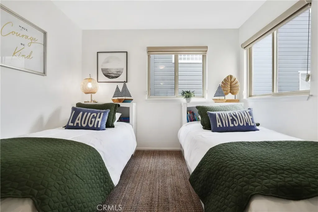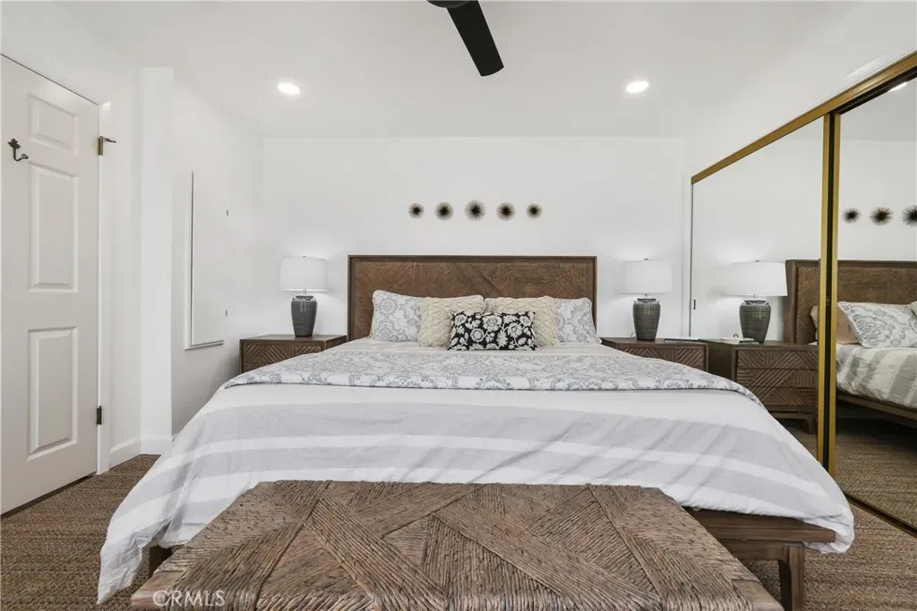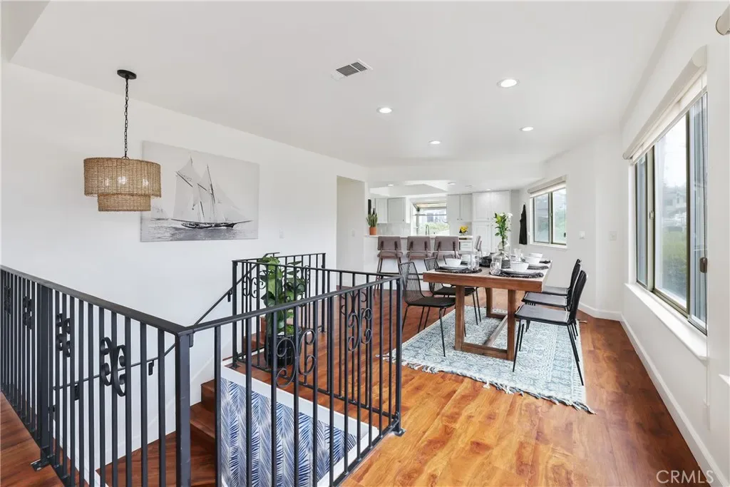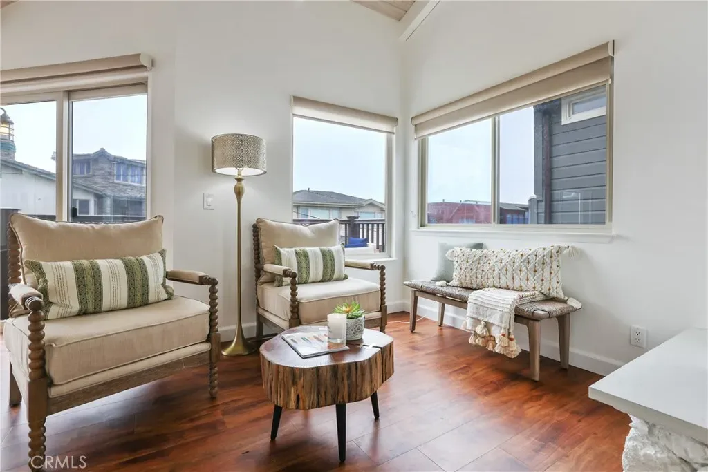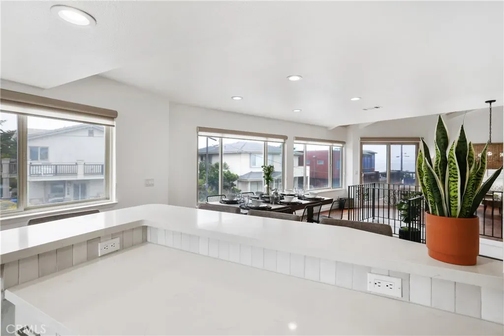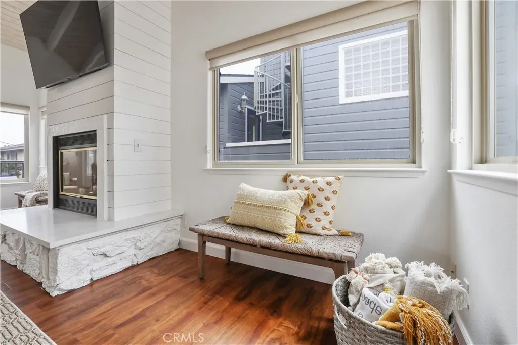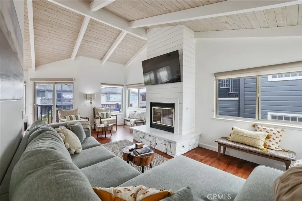 Bright, clean, and filled with natural light, the home blends modern comfort with timeless coastal charm. The classic white kitchen features elegant countertops, bar seating, and ample storage. A spacious dining area is surrounded by tall windows, while the living room showcases exposed wood beams and a cozy fireplace. Step out onto the balcony to enjoy partial ocean views and cool sea breezes.