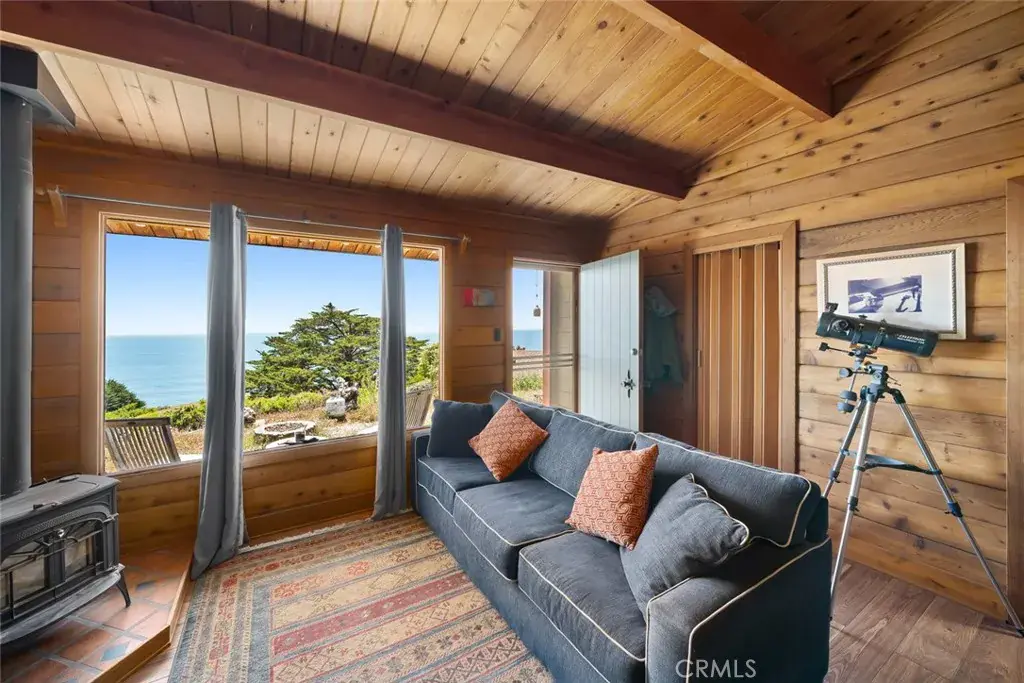 There are 3 structures on the property. The primary home, built in 1973, is a single-level 3,159sf 3 bedroom, 3 bath plus indoor laundry, adobe brick house. The primary living areas have high, wood-beamed ceilings, brick walls, and tile flooring. There is a beautiful wood-burning fireplace in the living room plus built-in shelving and seating areas. Multiple windows offer views of the ocean, mountains and overall property. There are multiple patio settings and an oversized 2-car garage with additional storage. A dimensional composition shingle roof is newer and the source of heat and AC in the home includes mini-splits and radiant heat. The cozy guest cottage is approximately 745sf and features 2 bedrooms and 1 bath, a living area with a wood stove and picture window, kitchen and indoor laundry. A workshop/garage and fenced garden are close by. There are panoramic ocean and mountain views from both properties.