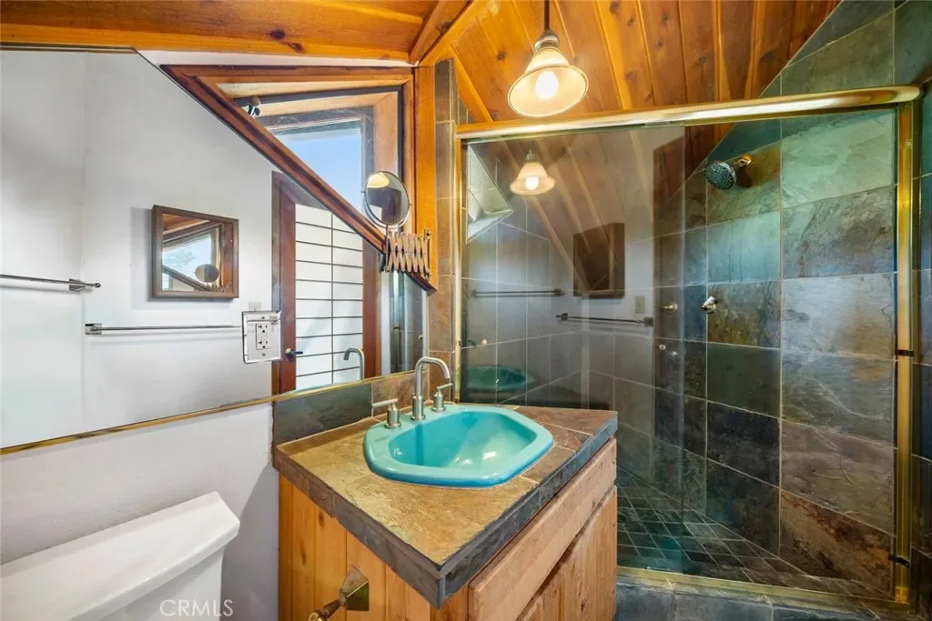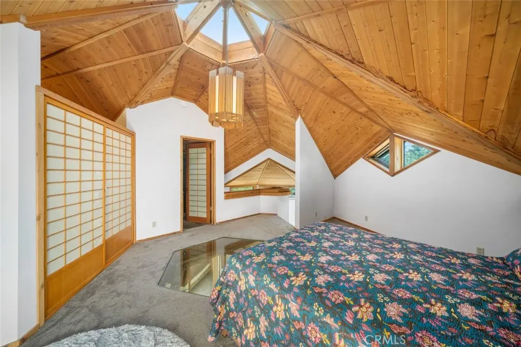 This property serves as an ideal creative retreat, a total of 3 bedrooms and 2 bathrooms. Featuring two spacious bedrooms and a full bathroom on the entry level. Make your way up to the private primary loft, a space designed to inspire with unreal sky views. A blend of Mid-Century and Japanese influences creates a relaxing yet energizing atmosphere throughout the home. Features such as the Shoji-style shades and the spherical Mid-Century Modern fireplace—framed by built-in wrap-around atrium seating—are sure to impress your guests.