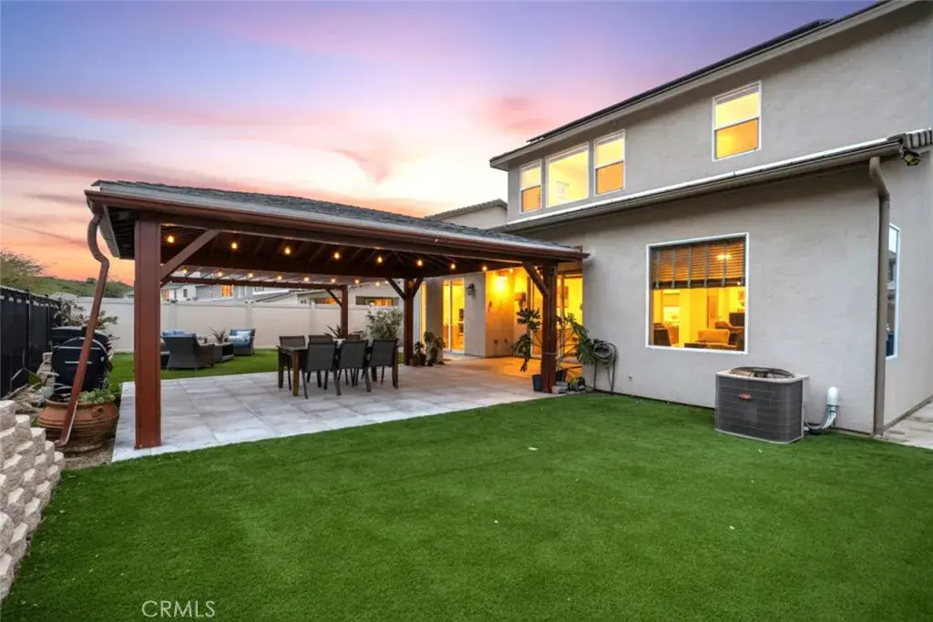The backyard provides a private outdoor setting with a covered patio, landscaped lawn, and space for outdoor dining or relaxation. A two car attached garage offers convenient parking and additional storage.