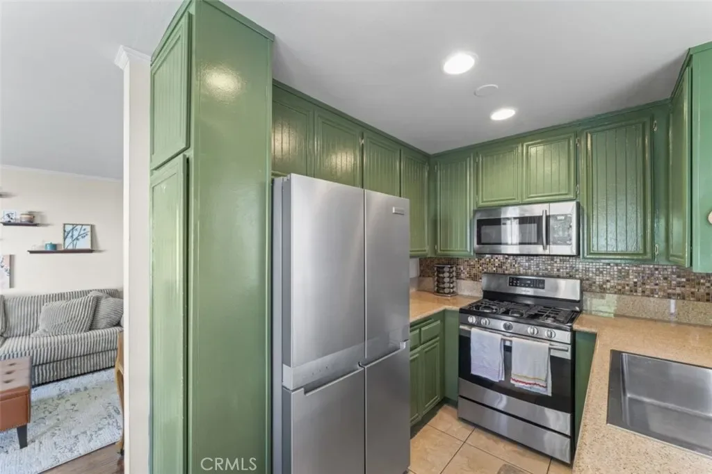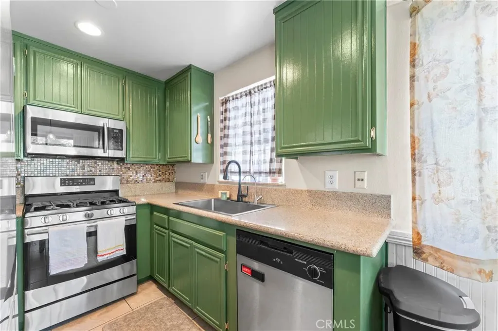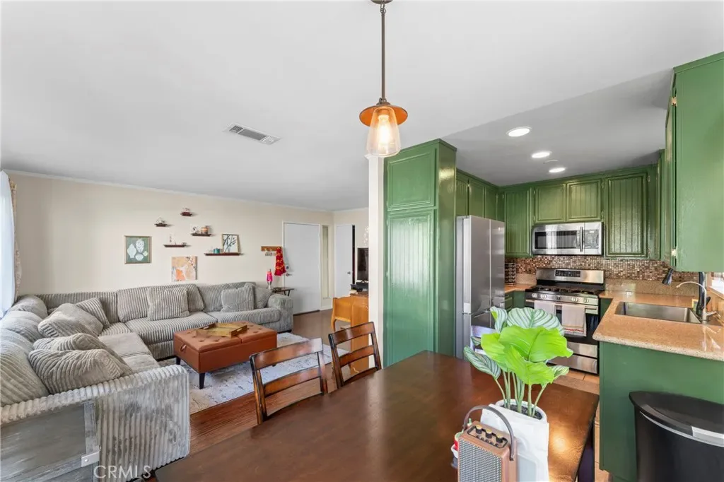 Inside, you’ll find modern flooring, stylish finishes, and a functional open layout. The kitchen features updated countertops, green cabinetry, and stainless steel appliances, flowing seamlessly into the living and dining areas—perfect for both everyday living and entertaining.
