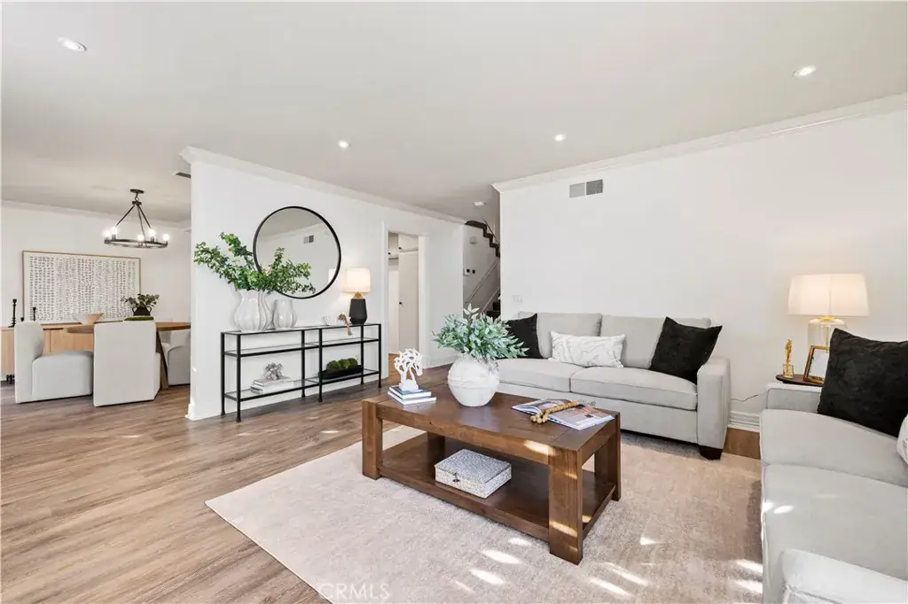 Welcome to this beautiful turnkey and move-in-ready home in the Canyon Gardens community of Sand Canyon. This spacious 4-bedroom, 3-bath residence offers approximately 1,601 sq ft of open-concept living and includes a highly sought-after first-floor bedroom and full bath—perfect for guests or multi-generational living. Upgrades include vinyl laminate flooring, fresh interior paint, newer light fixtures, recessed lighting, new kitchen countertops, and an updated HVAC system. The open floor-plan flows seamlessly to a private backyard ideal for relaxing and entertaining. Additional highlights include a two-car attached garage with abundant built-in storage plus driveway parking. HOA covers structure insurance, trash service, and front yard maintenance, and offers resort-style amenities including pool, spa, basketball court, park, playground, picnic area, and various sport courts. Ideally located with easy freeway access and just minutes from the new Sand Canyon Plaza featuring Sprouts Farmers Market, Handel’s Ice Cream, and popular dining and shopping. This rare 4-bedroom townhome lives like a detached home and delivers exceptional value. A true opportunity you don’t want to miss.