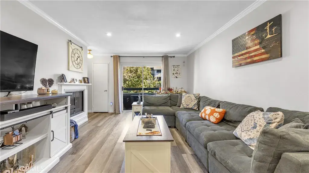 Step into this gorgeous and well-cared-for home featuring an open-concept living and dining area with stylish laminate flooring and a cozy fireplace. A sliding glass door opens to a private balcony with pleasant neighborhood views—perfect for relaxing or entertaining.