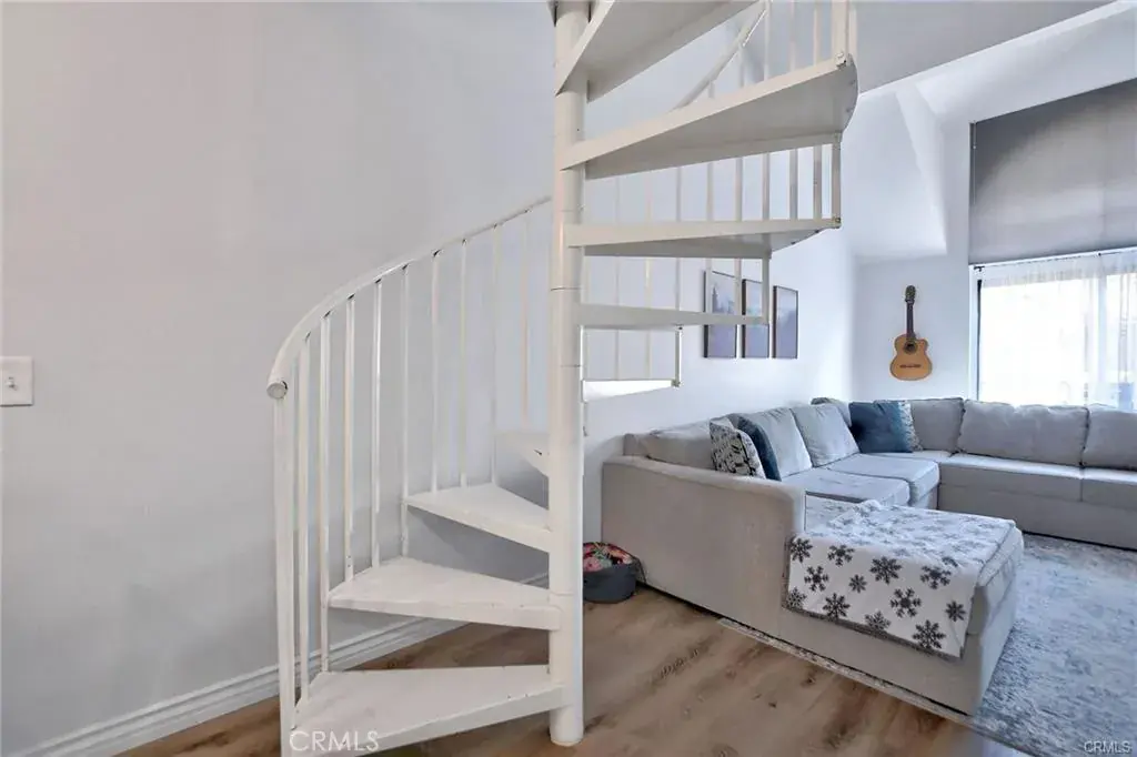 Discover this peaceful condo in Princessa Estates, surrounded by lush greenery and beautifully maintained landscaping. The interior features high ceilings and a spiral staircase leading to a versatile loft space, suitable for a home office or den. The open living area is finished with laminate flooring, recessed smart lighting, and modern baseboards.