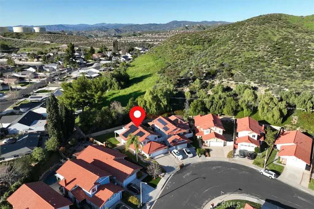 Welcome to this light and bright two-story home, perfectly situated on a quiet street with a large wrap-around yard, no rear neighbors, and serene hillside views. Step inside to the formal living room featuring soaring ceilings, oversized windows, and elegant French doors leading to the backyard, filling the space with natural light. Just off the entry is a versatile downstairs bedroom currently used as a den, complete with custom built-ins, a faux fireplace with heater, and mounted TV. Nearby, the beautifully remodeled downstairs bathroom features a tiled walk-in shower, newer vanity, and mirror. Continue down the hall to the kitchen, which offers granite countertops, a full tile backsplash to the ceiling, stainless steel appliances, recessed lighting, bar seating, and a dining area, with the laundry conveniently tucked away in a nearby closet. The spacious family room showcases a charming brick fireplace and sliding glass doors that lead to the private backyard, creating a cozy yet functional space for everyday living. Step outside to enjoy a large solid covered patio plus an additional slatted patio that allows for extra light, all backing to a gorgeous green hillside offering exceptional privacy and serenity with no rear neighbors. The expansive wrap-around grassy yard provides plenty of space for play, pets, gardening, or entertaining. Upstairs features three additional bedrooms, including a spacious primary suite with high ceilings and a large sliding glass door flanked by satellite windows, opening to an incredible balcony with sweeping hill views. The en-suite bath includes dual sinks and a walk-in shower. Two secondary bedrooms offer high ceilings, ceiling fans, and neighborhood and valley views, with a hall bath featuring a tub/shower combo. Additional highlights include laminate flooring throughout the downstairs, carpet on the stairs and upstairs, plantation shutters on every window, updated windows and glass doors, an updated HVAC system, a leased solar system that provides an annual Edison credit, and a low HOA that keeps the community beautifully maintained. Hurry! This is an exceptional opportunity you won’t want to miss.