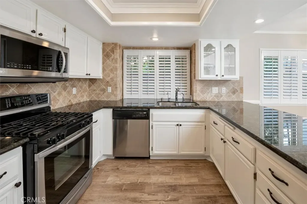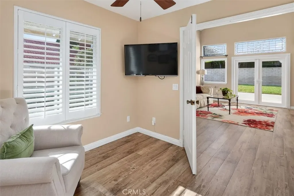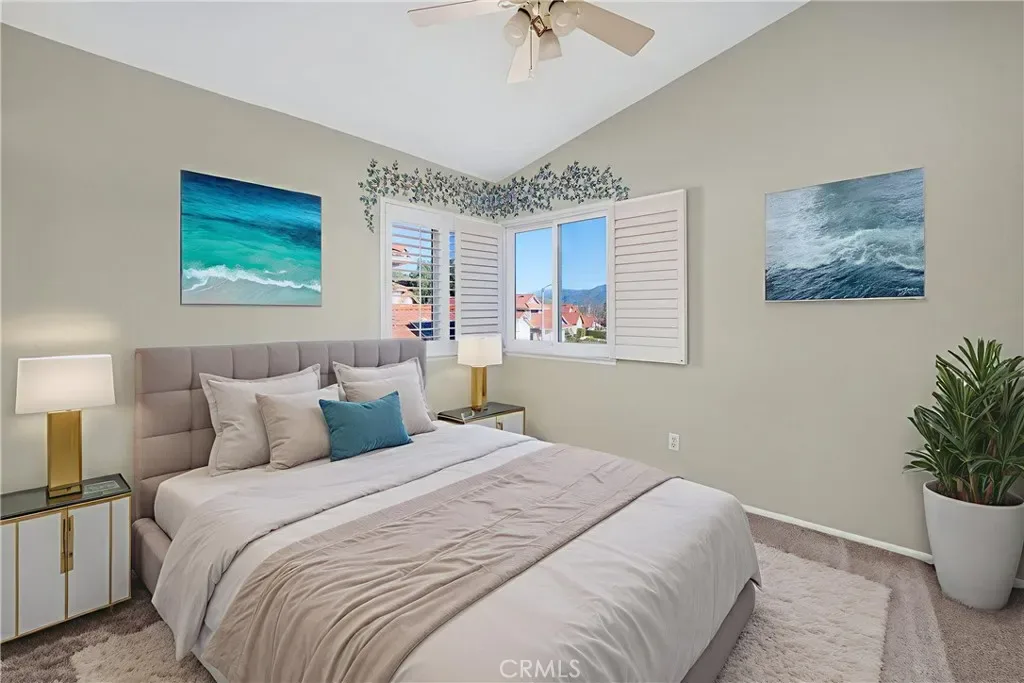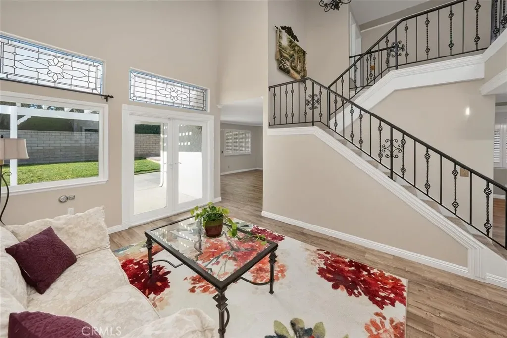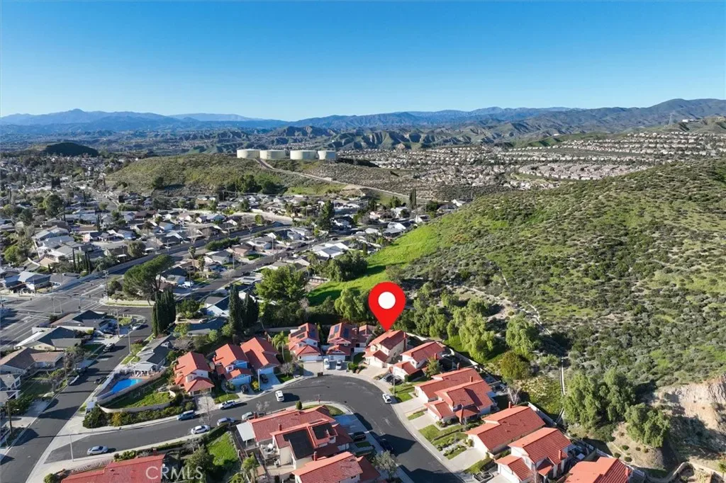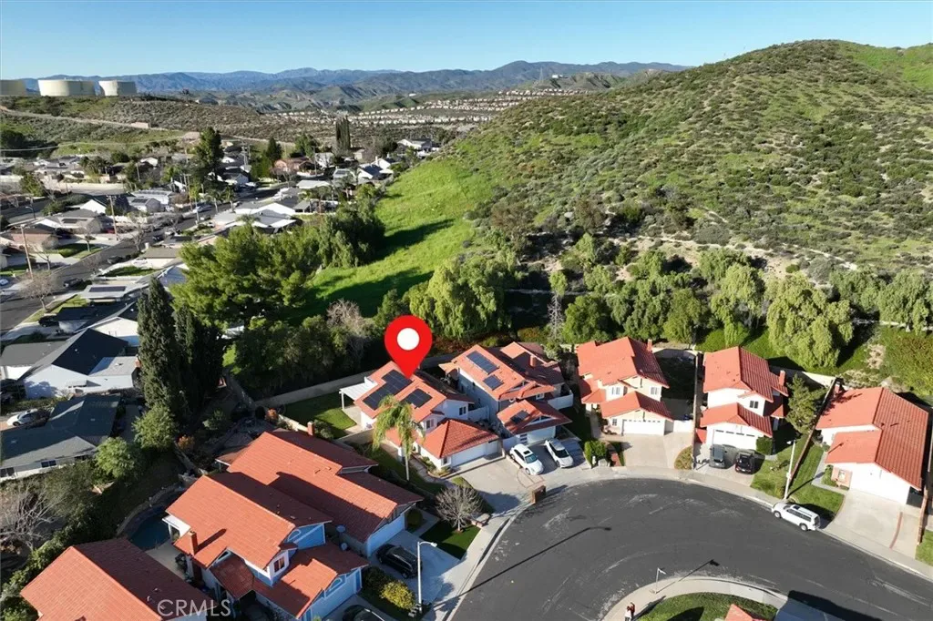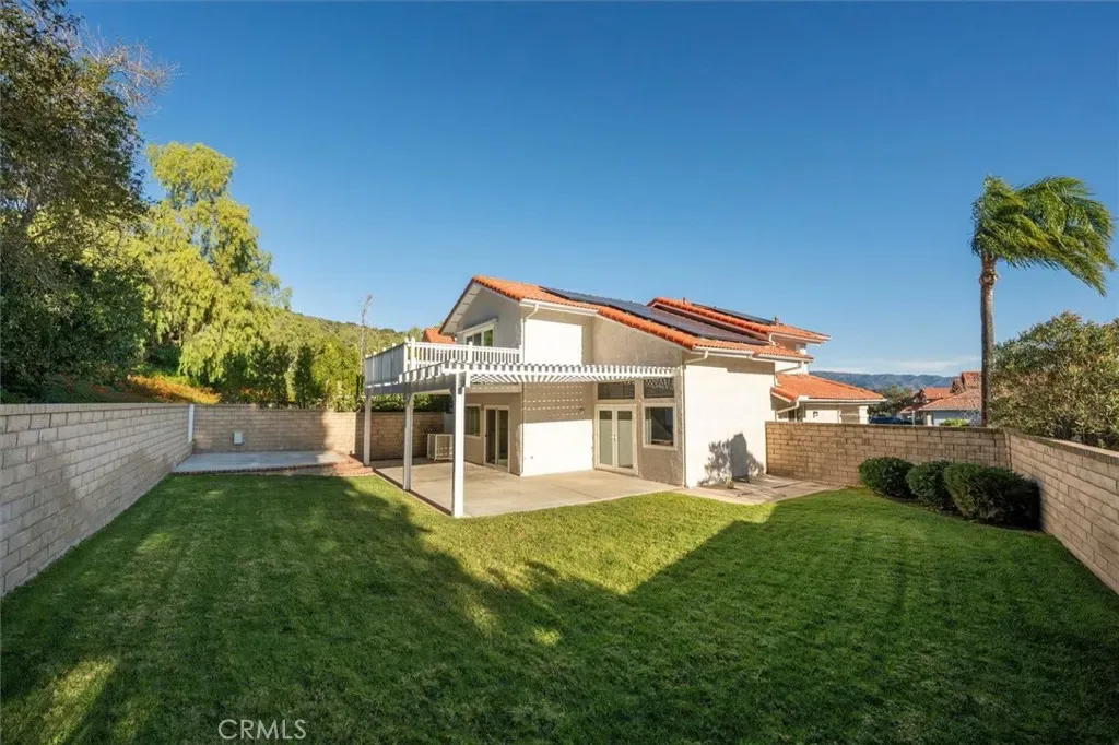 Welcome to this light and bright two-story home, perfectly situated on a quiet street with a large wrap-around yard, no rear neighbors, and serene hillside views. Step inside to the formal living room featuring soaring ceilings, oversized windows, and elegant French doors leading to the backyard, filling the space with natural light. Just off the entry is a versatile downstairs bedroom currently used as a den, complete with custom built-ins, a faux fireplace with heater, and mounted TV. Nearby, the beautifully remodeled downstairs bathroom features a tiled walk-in shower, newer vanity, and mirror. Continue down the hall to the kitchen, which offers granite countertops, a full tile backsplash to the ceiling, stainless steel appliances, recessed lighting, bar seating, and a dining area, with the laundry conveniently tucked away in a nearby closet. The spacious family room showcases a charming brick fireplace and sliding glass doors that lead to the private backyard, creating a cozy yet functional space for everyday living. Step outside to enjoy a large solid covered patio plus an additional slatted patio that allows for extra light, all backing to a gorgeous green hillside offering exceptional privacy and serenity with no rear neighbors. The expansive wrap-around grassy yard provides plenty of space for play, pets, gardening, or entertaining. Upstairs features three additional bedrooms, including a spacious primary suite with high ceilings and a large sliding glass door flanked by satellite windows, opening to an incredible balcony with sweeping hill views. The en-suite bath includes dual sinks and a walk-in shower. Two secondary bedrooms offer high ceilings, ceiling fans, and neighborhood and valley views, with a hall bath featuring a tub/shower combo. Additional highlights include laminate flooring throughout the downstairs, carpet on the stairs and upstairs, plantation shutters on every window, updated windows and glass doors, an updated HVAC system, a leased solar system that provides an annual Edison credit, and a low HOA that keeps the community beautifully maintained. Hurry! This is an exceptional opportunity you won’t want to miss.