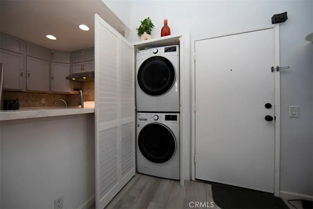 Beautiful, bright corner-unit condo featuring 2 bedrooms and 2 bathrooms. The primary bedroom offers a private en-suite bath and walk-in closet, while the second bedroom is conveniently located near the hallway bath. The spacious living room showcases high vaulted ceilings with wood paneling and abundant natural light. The open-concept kitchen connects seamlessly to the dining and living areas and features stainless steel appliances, a white stove, and an in-unit washer and dryer—ideal for entertaining. Custom features include a wall cabinet bar and a built-in Murphy bed, adding functionality and style. Laminate flooring throughout. Enjoy a private balcony with pool and greenbelt views, along with a small storage area. Two conveniently located parking spaces included. HOA amenities include a pool and spa. Walking distance to shopping, theaters, and restaurants, with nearby hiking and biking trails and easy freeway access. Very unique touches throughout. Move-in ready.