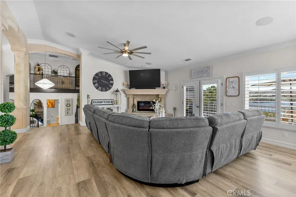 Welcome to Village Way where luxury meets lake life! This beautifully remodeled Mediterranean style home is located near the Main Lake in Canyon Lake. Designed with both elegance and functionality in mind, this home offers a thoughtfully curated layout and upgrades that make everyday living and entertaining effortless. Step inside to soaring ceilings highlighted by a crystal chandelier, luxury vinyl plank flooring flowing into the expansive great room and cozy fireplace. The remodeled kitchen is the heart of the home, featuring an island, granite countertops, stainless steel appliances and shutters framing a lake view from areas of the home. The property offers two spacious primary suites, each with walk in closets and private balcony access perfect for relaxing and enjoying the surrounding scenery. Two additional bedrooms feature recently added luxury vinyl plank flooring and private en-suite bathrooms, ideal for family or guests. Downstairs offers additional flexible living space with a bar, open living area, and a convenient half bath ideal for entertaining or gatherings. Outdoor living shines with a recently refinished Pebble Tec pool and spa, built-in firepit, refreshed landscaping and a expansive deck ideal for entertaining or unwinding. An oversized tandem garage provides space for multiple vehicles and a golf cart garage, along with potential boat or RV parking. Additional upgrades newer HVAC units, luxury vinyl planking, solar panels, improved irrigation, offering a truly move-in-ready experience. Located just moments from the main boat launch and nearby park, residents enjoy all that Canyon Lake has to offer: a 384-acre waterski and fishing lake, golf course, parks, beaches, pools, equestrian center, restaurants, community events, and golf-cart-friendly streets.