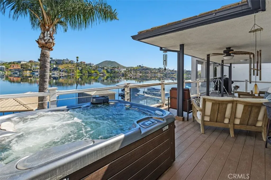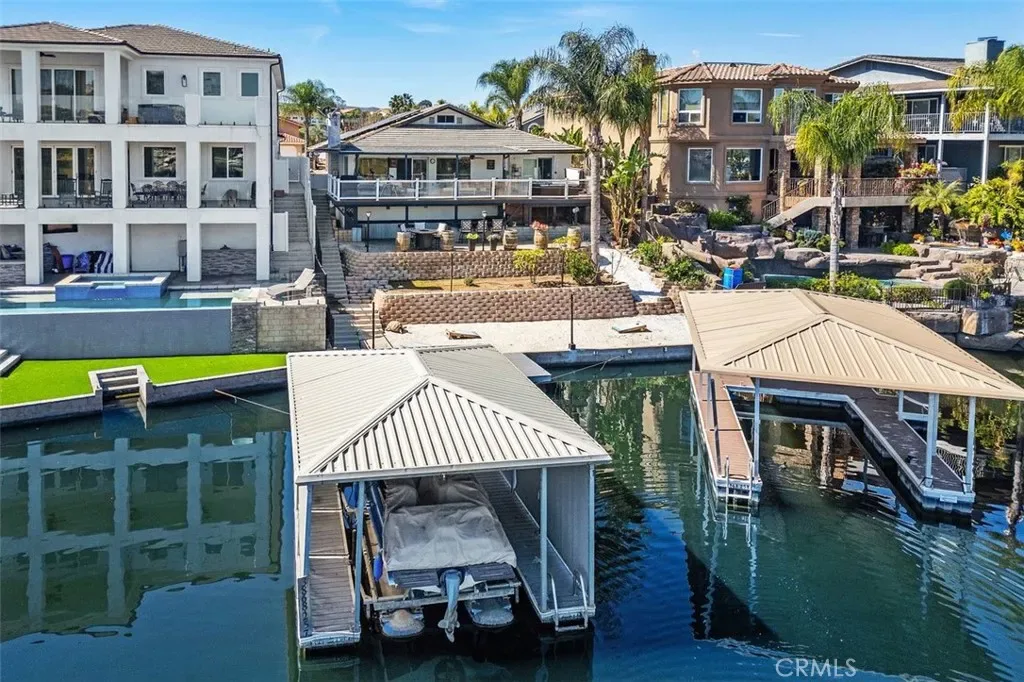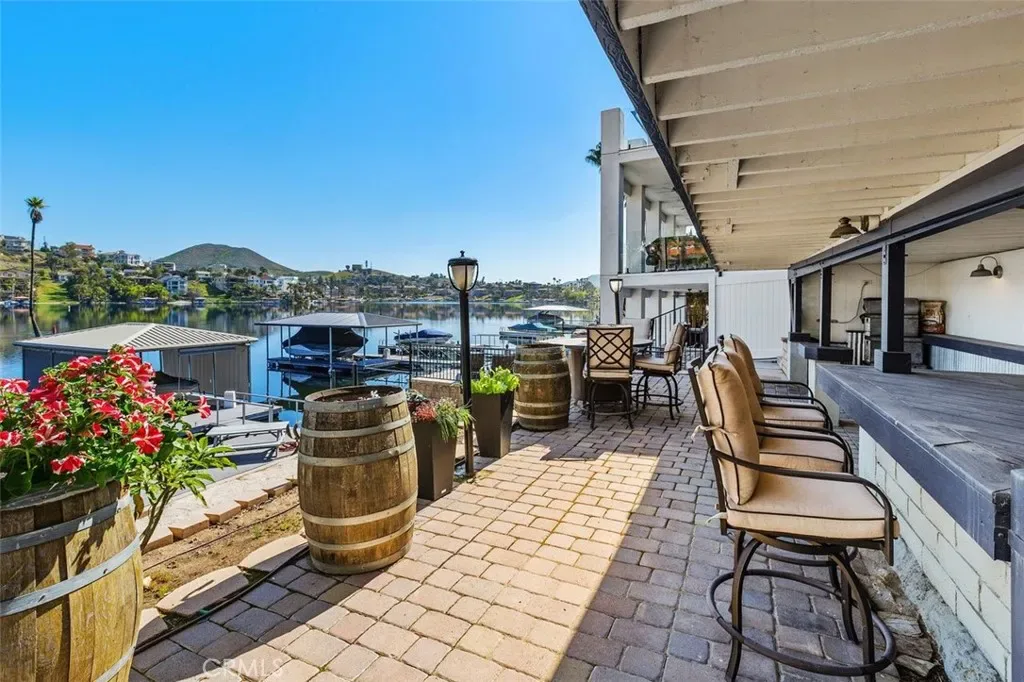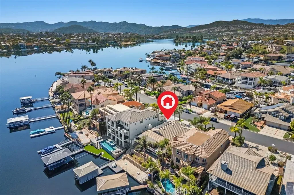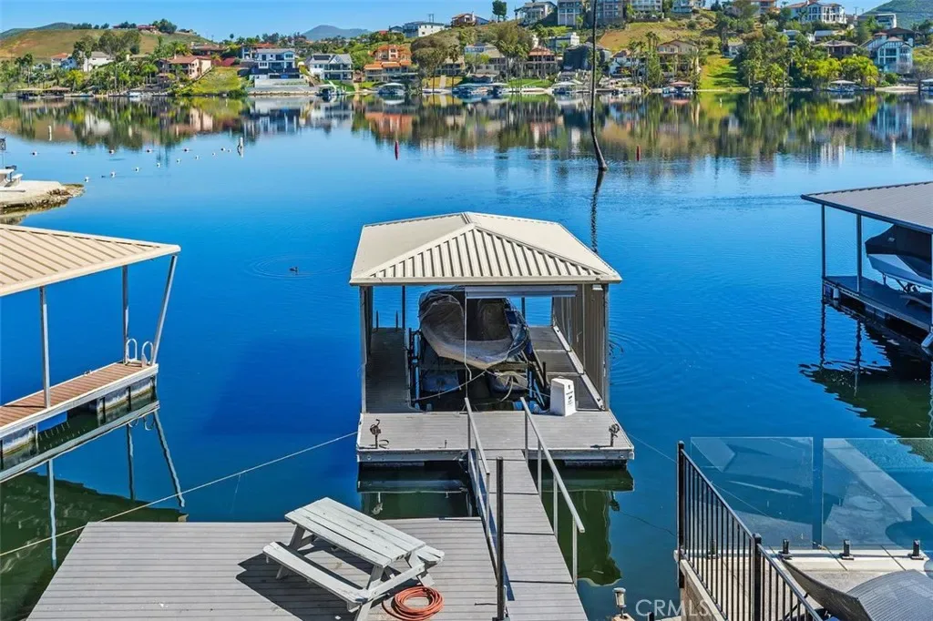 Luxury main-lake waterfront home in Canyon Lake featuring panoramic water views, a private dock with covered boat slip and lift, and exceptional indoor-outdoor living. This single-story, move-in-ready home offers an open-concept kitchen and family room with granite countertops, stainless steel appliances, hardwood flooring, and expansive view windows.