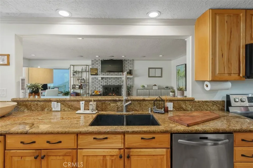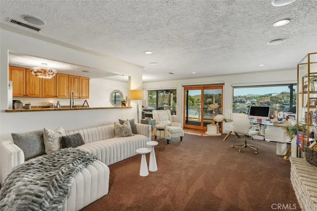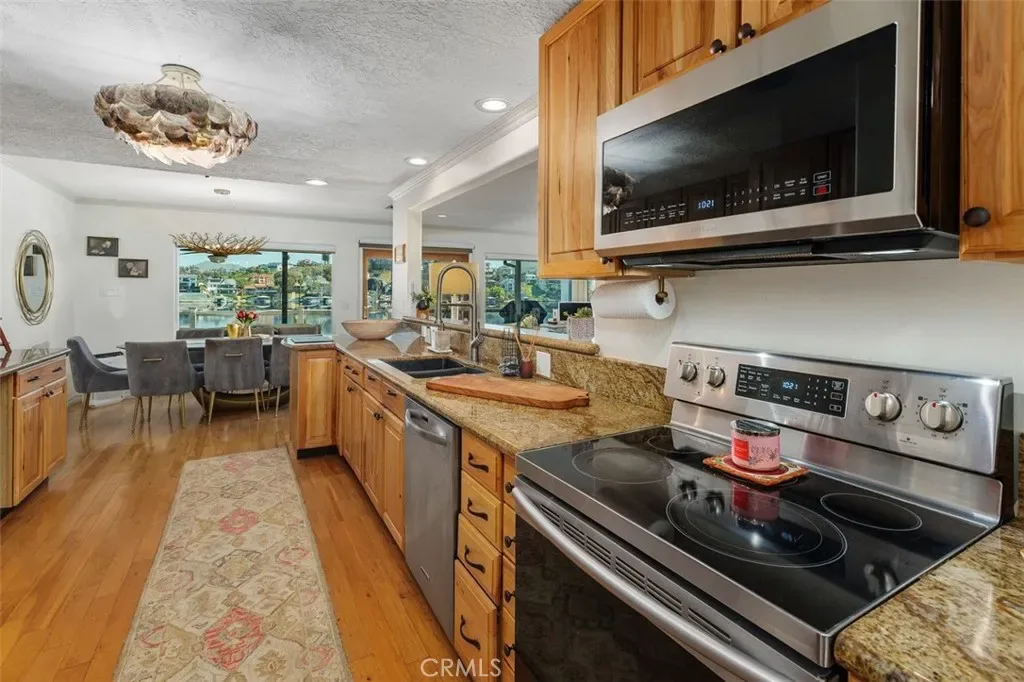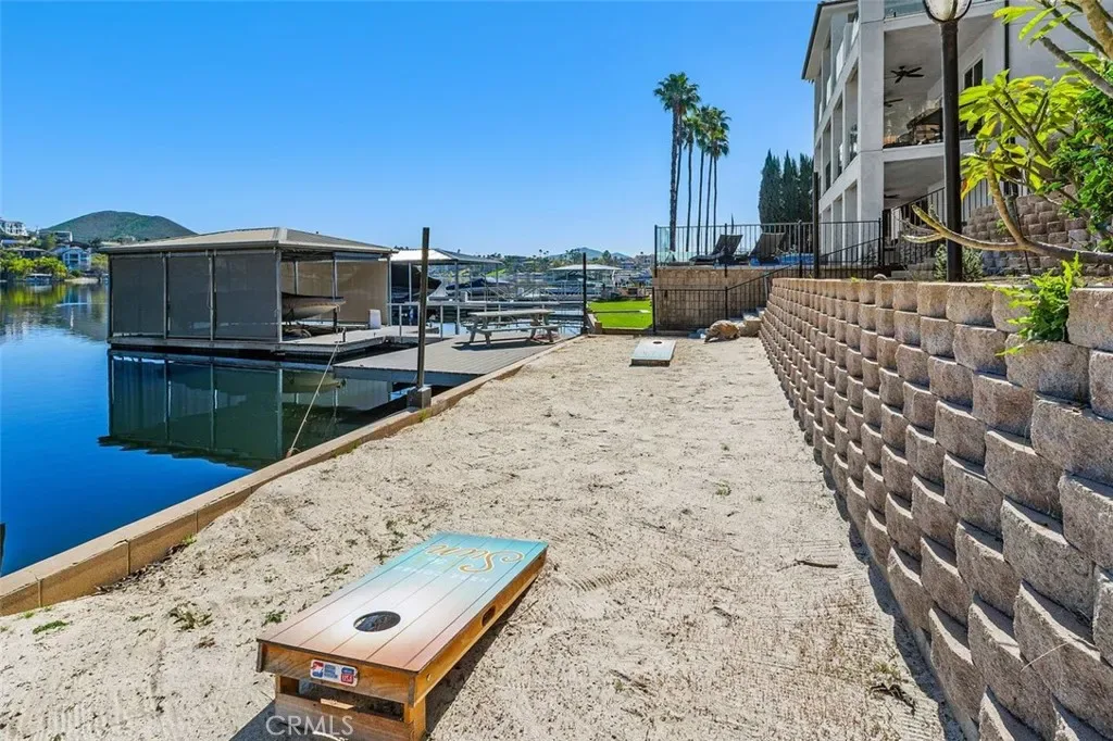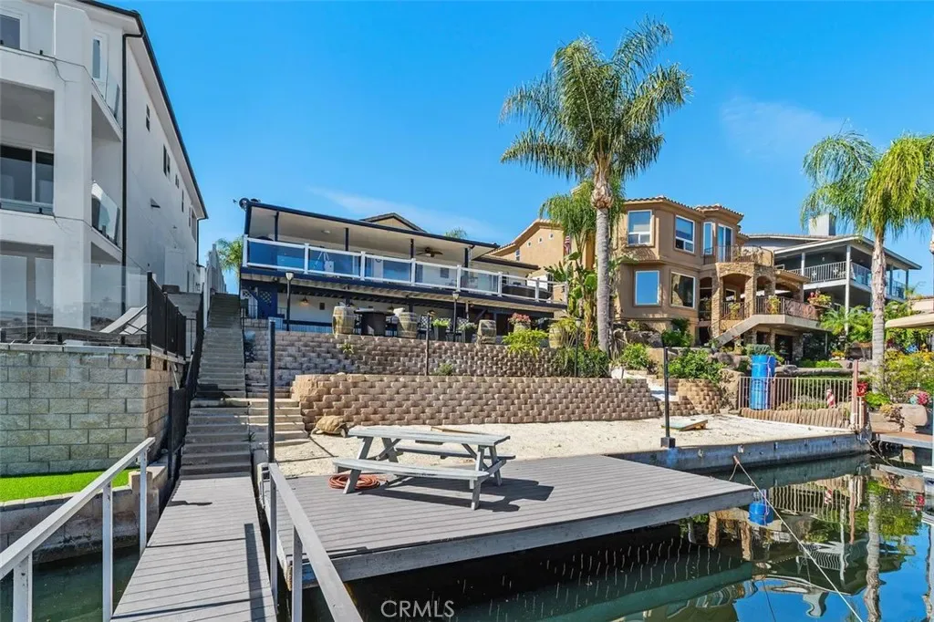 Luxury main-lake waterfront home in Canyon Lake featuring panoramic water views, a private dock with covered boat slip and lift, and exceptional indoor-outdoor living. This single-story, move-in-ready home offers an open-concept kitchen and family room with granite countertops, stainless steel appliances, hardwood flooring, and expansive view windows.
