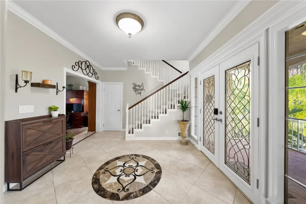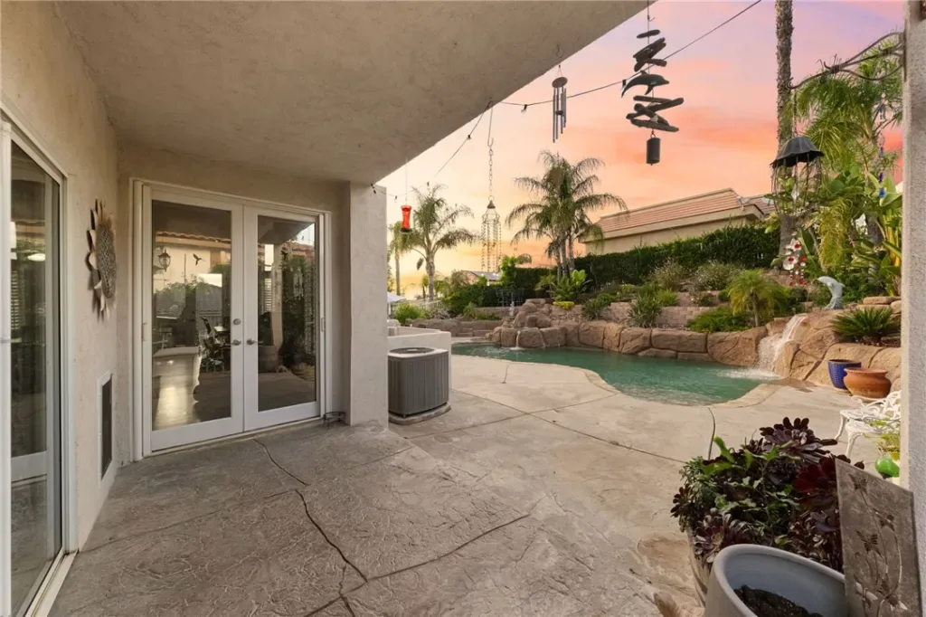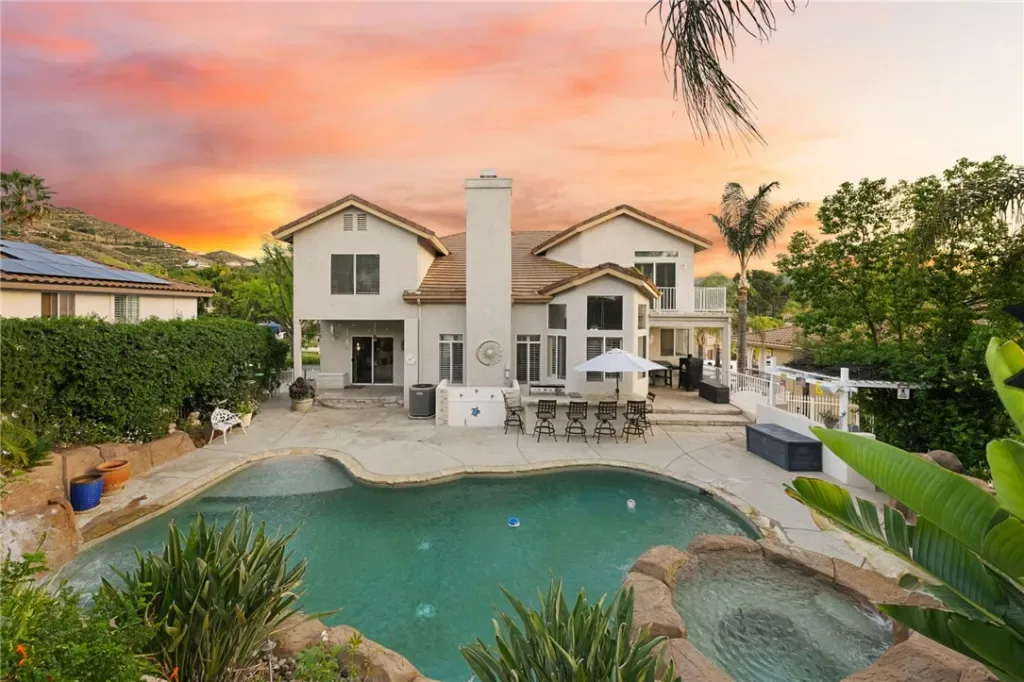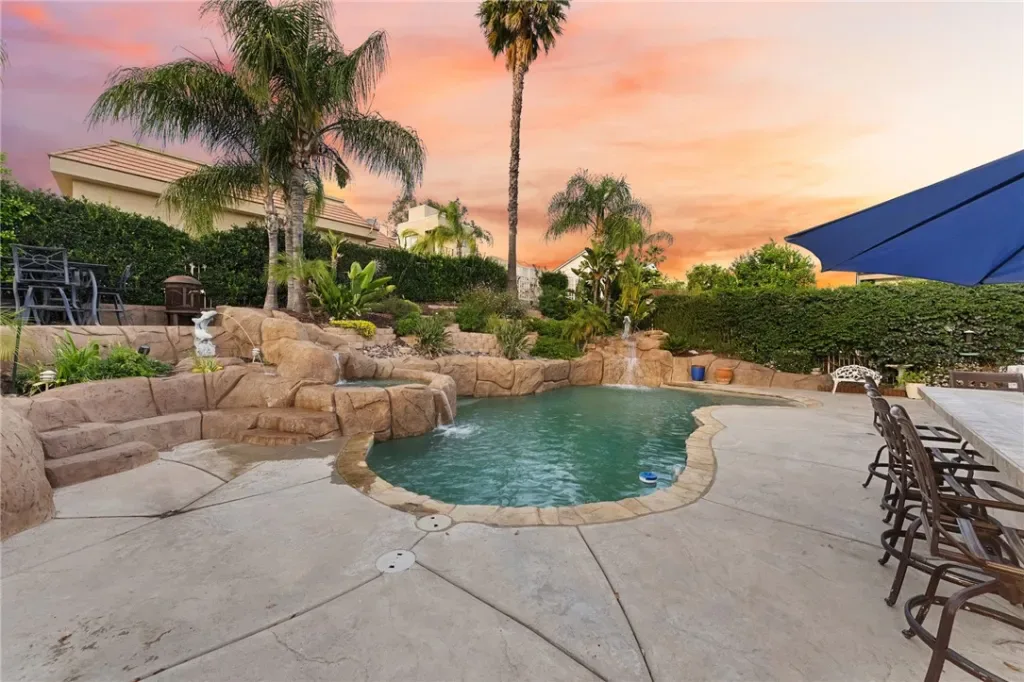 Step outside to your resort-style backyard, featuring a sparkling pool and spa with dramatic double waterfall features, a built-in barbecue island with refrigerator, and breathtaking sunrise and sunset views.