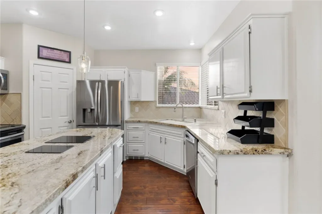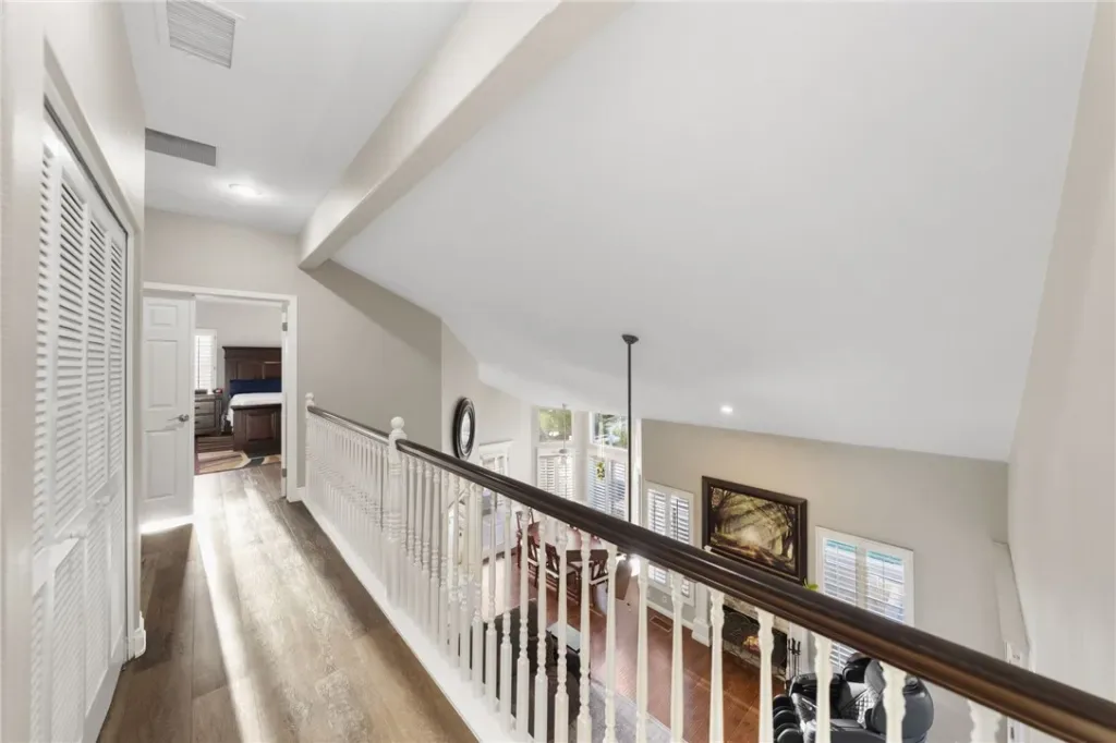 The open and inviting kitchen is equipped with granite countertops, ample cabinetry, a walk-in pantry, and large windows adorned with plantation shutters, filling the home with abundant natural light. The main level showcases beautiful wood flooring, while the upstairs features stylish LVP flooring throughout.