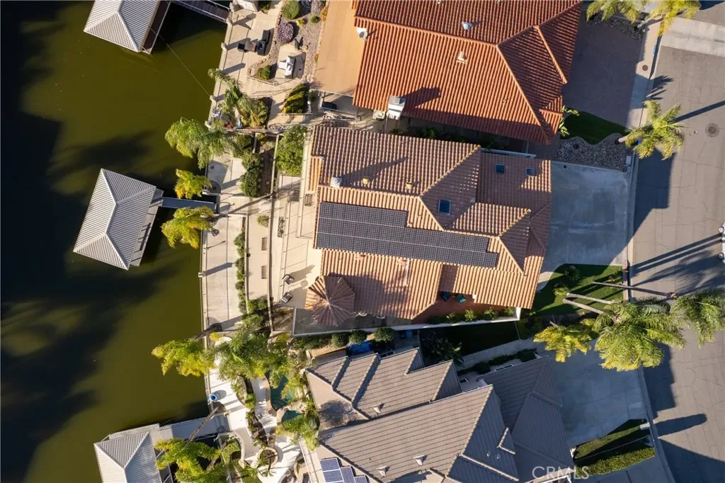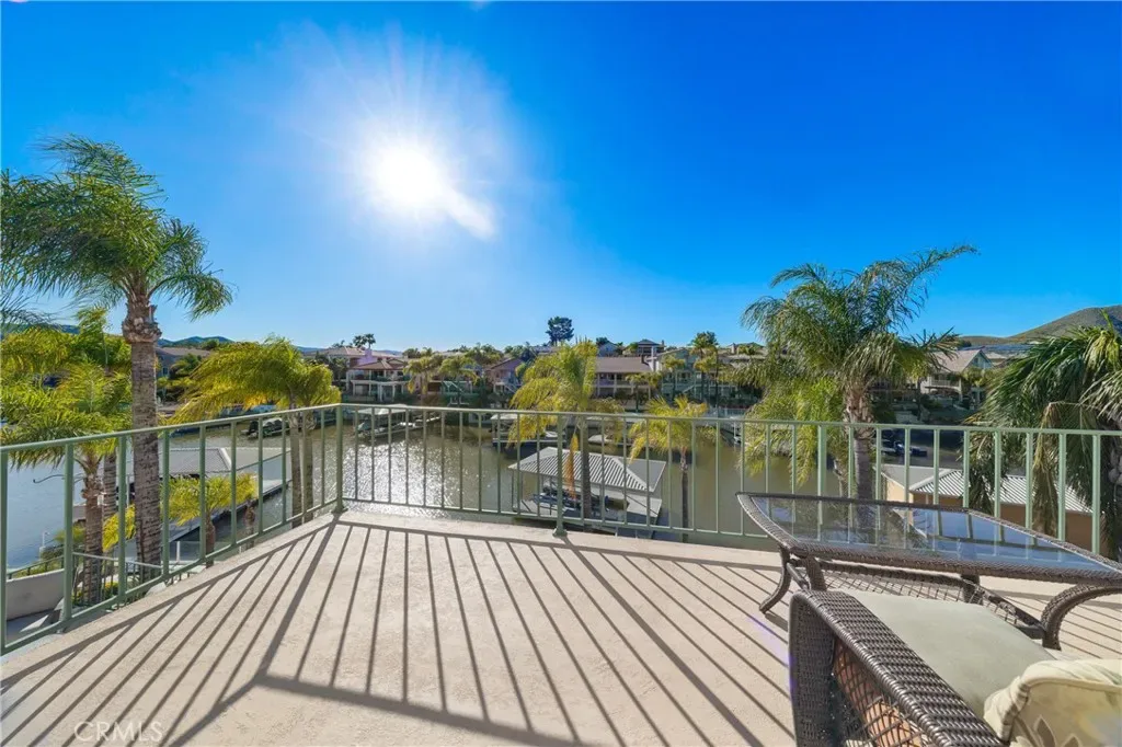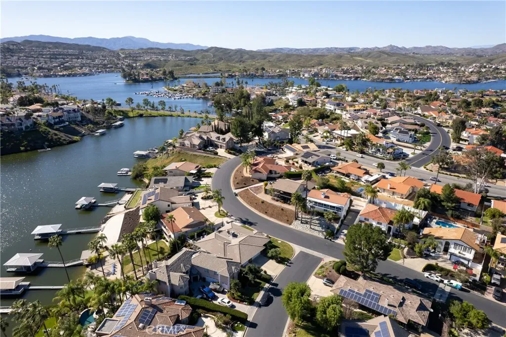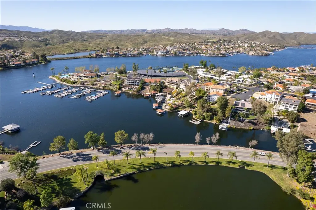 Welcome to your own slice of waterfront paradise, where peaceful LAKE FRONT living meets comfort, space, and unforgettable views! Situated on a quiet canal off the East Bay, this beautiful 4-bedroom, 3.5-bath home offers approximately 3,100 square feet of living space, 70 feet of water frontage, and a private aluminum boat dock with an electric lift—perfect for enjoying the Canyon Lake boating lifestyle right from your backyard. Inside, a warm and inviting layout features elegant touches and custom construction designed for seismic safety and a zero fire-rating structure. A charming entry foyer with a lighted alcove leads to the living room with a walk-in wet bar, while a dual-facing fireplace connects the living and family rooms. Sliding glass doors open to the back patio, creating a seamless indoor-outdoor space with relaxing lake views. The kitchen flows into the informal dining area with a vaulted ceiling and a beautiful circular wall of windows that frame tranquil water views and fill the space with natural light. Upstairs, the spacious primary suite offers a vaulted ceiling, ceiling fan, and a private balcony with sweeping lake views. The primary bath includes a dual-sink vanity, soaking tub, and walk-in shower with heating and a built-in bench. Two additional upstairs bedrooms feature oversized closets and share a well-appointed hall bath. Downstairs, a private bedroom with its own full bath and separate side-yard entrance is ideal for guests, extended family, or a home office. The home also features an oversized laundry room with a deep sink and storage, plus a spacious garage with skylights, built-in storage, two 220 outlets, a second washer/dryer hookup, and a heat-pump powered water heater. The extended driveway offers full RV hookups including 110 and 220 connections, a dump station, and cable. Energy efficiency is enhanced by a fully paid 40-panel solar system with a new inverter. Just steps from the patio, your 70 feet of waterfront lead to the covered dock and electric boat lift—perfect for boating, fishing, paddleboarding, or relaxing on the water. Canyon Lake residents enjoy resort-style amenities including a clubhouse with restaurant, pool and spa, fitness center, parks, sports courts, equestrian facilities, and the Canyon Lake Golf Course. Homes like this rarely come along—offering comfort, thoughtful design, and the ultimate lake lifestyle. Come experience the views, space, and charm of this special waterfront home!