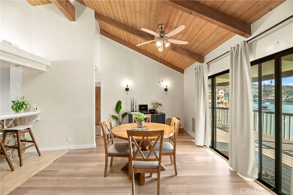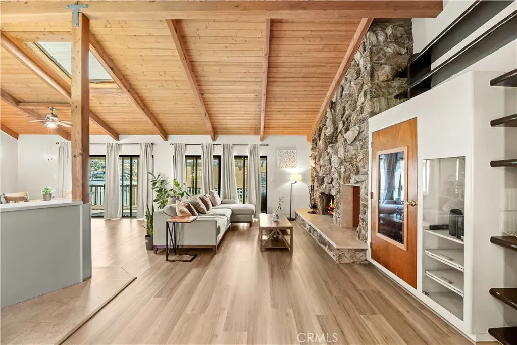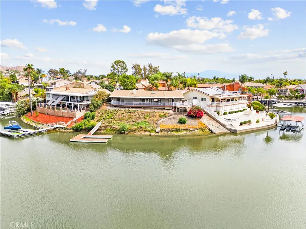 PRIVE IMPROVEMENT – Enjoy true waterfront living in this rare 3-bedroom, 2-bath home situated on a generous pie shaped lot at the end of a quiet cul-de-sac. This single-story gem boasts a private boat dock and a spacious wrap around deck overlooking the water perfect for relaxing mornings and stunning sunsets. Inside, soaring vaulted wood-beam ceilings and a skylight create an open, airy feel. Floor-to-ceiling glass sliders flood the living space with natural light and provide seamless access to the deck and lake views. A dramatic stone fireplace anchors the great room, creating a cozy focal point. The kitchen is designed for entertaining and daily living alike, featuring stainless steel double ovens, a cooktop facing the living area, a large breakfast bar peninsula, and a pantry with pull-out shelving. Charming details like a garden window over the sink and stone accented breakfast bar add character. The master suite is a lakeside retreat with vaulted ceilings, a ceiling fan, and private deck access. Its en-suite bath includes a soaking tub, separate walk-in shower, dual sinks, and ample storage. Two additional bedrooms also offer vaulted ceilings and ceiling fans, with one providing private deck access and a walk-in closet. Step outside to your private boat dock and a terraced backyard stretching to the shoreline, perfect for water activities or creating a resort-like outdoor space. The attached 2-car garage and extended driveway provide ample parking for vehicles and guests. Living in Canyon Lake means access to resort-style amenities like a private lake for boating, fishing, swimming, an 18-hole golf course, tennis and pickleball courts, Olympic-sized pool, parks, playgrounds, and a vibrant social community. The home’s location near the East Gate offers quick access and nearby community features such as the dog park and sports courts. 30199 Windward Drive is more than a home it’s a lifestyle. Don’t miss this rare opportunity to own a waterfront oasis in one of Southern California’s most sought-after gated communities.