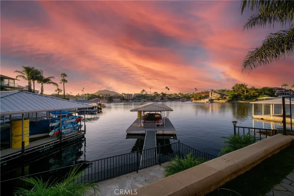 The moment you enter this Tuscan masterpiece, your dreams of lake living will be complete. This custom home is nestled on a cul de sac with no expense spared. A grand and huge two story foyer plus an amazing curved stair case welcomes you to this masterpiece. Located on the east bay of Canyon Lake, a gated community in Riverside County. One of five gated cities in California, Canyon Lake is an incredible place to live. This Tuscan beauty has one bedroom downstairs, a 3/4 bathroom and a powder room with the remaining bedrooms including the sprawling master suite upstairs, the master closet and bathroom are to die for. Gorgeous water views greet you from multiple balconies and windows. Luxurious plaster walls and soft corners provide a soothing flow throughout the home. In addition to the master suite, there are three other bedrooms upstairs, one of the bedrooms does not have a closet, it can be a theatre, a large office or a 5th bedroom. House has been updated with led lights, smart switches and smart smoke detectors. Custom automated window coverings installed in 2022. There is a small room attached to the garage for more storage. The driveway is flat for your toys and the large, three-car garage has plenty of storage built-ins. The tiered backyard has additional living and dining space, Jacuzzi, built in bar and entertainment space as well as turf for easy maintenance. Your private covered dock with lift is waiting for you.