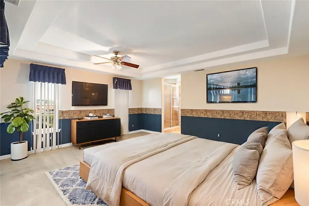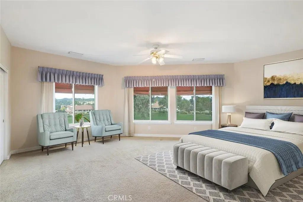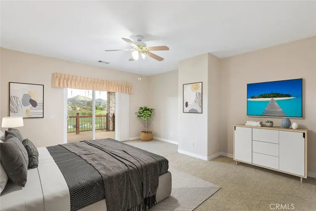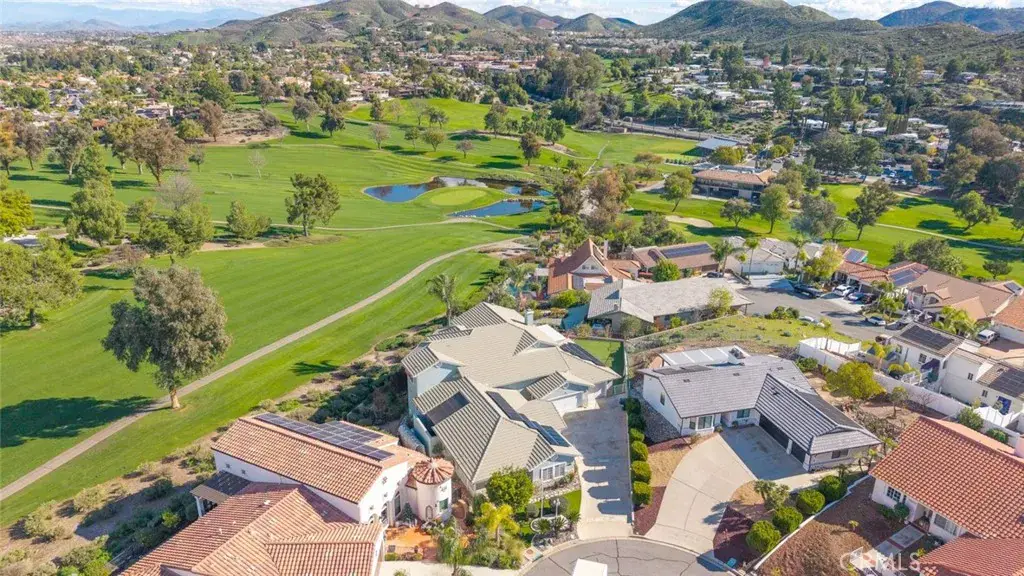 Put this home on the must-see list! Don’t miss this exceptional Canyon Lake residence, perfectly positioned at the end of a desirable cul-de-sac with stunning panoramic golf course views. This expansive home offers 5 bedrooms and 3.5 bathrooms, including two full ensuite primary bedrooms on the main level. An additional downstairs bedroom is currently used as a den or office, along with a formal living room and formal dining area. One primary suite offers dual sinks, walk-in shower, and walk-in closet, while the second features a walk-in shower, Jacuzzi tub, vanity area, and walk-in closet. A private outdoor sitting area sits between the two suites—perfect for morning coffee. Notable upgrades include high ceilings, LOW taxes, PAID-OFF solar, QuietCool whole-house fan, new vinyl windows, and a four-car tandem garage with epoxy floors and extensive storage. Travertine tile flooring runs throughout the main level with tasteful carpet insets in gathering spaces. The kitchen is beautifully appointed with birch cabinetry, imported Italian granite countertops, electric cooktop, double oven, microwave, dishwasher, center island with bar seating, and a dining area showcasing incredible golf course views. The kitchen opens to a spacious family room, creating a large great room with a built-in entertainment center, fireplace, and sliding doors leading to a massive Trex deck with covered patio, flagstone accents, and Alumawood patio cover. Plantation shutters and ceiling fans are featured throughout the main level, along with a convenient guest powder room. The oversized downstairs laundry room includes abundant cabinetry, counter space, and a utility sink. The backyard is meticulously maintained with turf landscaping, a designated dog area, and two large storage areas beneath the deck. Upstairs includes two additional bedrooms, a full bathroom with dual sinks, and a massive loft with wet bar, built-ins, private deck access, and breathtaking golf course views. Additional highlights include three A/C units, rain gutters throughout, lifetime transferable exterior paint warranty, and low-maintenance front and rear landscaping. Enjoy resort-style living with guarded gate entry, 18-hole golf course, 400-acre private lake, Jr. Olympic pool and kids’ pool, restaurants, beaches, parks, pickleball and tennis courts, equestrian facilities, campground, senior center, and easy access to shopping, schools, and the 15 & 215 freeways.