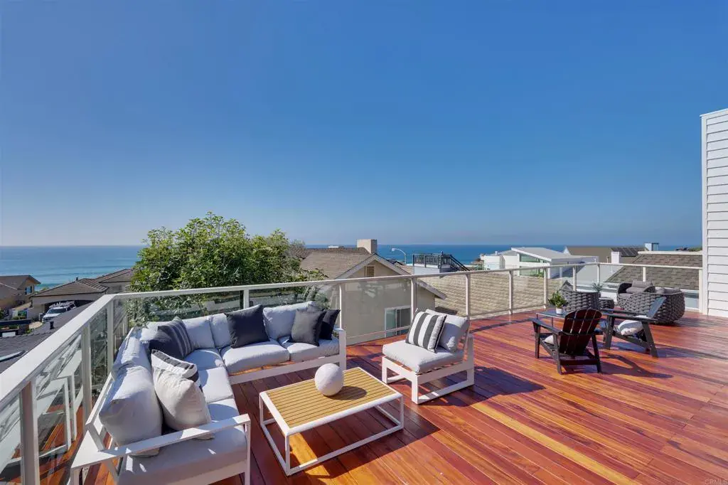 The neighbor owns the air rights to the one story home behind the subject property to preserve the ocean views!! Please ask listing agent for more details. Completely reimagined from top to bottom, this beyond-stunning residence offers a rare blend of coastal sophistication and modern design, all in one of Carlsbad’s most desirable locations. Every inch of the home has been meticulously updated with high-end finishes and thoughtful detail, creating a truly turnkey experience. At the heart of the home lies an incredible chef’s kitchen that rivals any professional setup. Anchored by an oversized island with waterfall-edge quartzite countertops, it features a full suite of Viking appliances—including a built-in refrigerator, dual-oven 8-burner range—making it as functional as it is beautiful. New custom cabinetry and Delta fixtures complement the space, while Fleetwood exterior sliding doors invite natural light and effortless indoor-outdoor flow. The kitchen opens to the main living and dining areas, where engineered hardwood flooring, a sleek fireplace, and a stylish built-in bar with a wine fridge create an inviting setting for everyday living and entertaining. The first floor includes two spacious bedrooms, each with its own en suite bath, offering comfort and privacy for family or guests. The second level is dedicated to the primary suite, a true sanctuary showcasing a vaulted, wood-clad ceiling with a large skylight—bringing warmth, texture, and an airy coastal feel. The spa-inspired bathroom impresses with a custom-built vanity, quartzite counters, and Delta fixtures, along with an oversized walk-in shower and freestanding soaking tub. A separate custom-designed walk-in closet provides beautifully organized storage for an elevated everyday experience. On this level, you’ll also find a finished bonus room, ideal as a kids’ playroom, creative space, or additional storage. Every one of the four bedrooms includes its own en suite bath, each featuring quartzite or marble countertops and refined designer finishes, while three-panel shaker doors add a consistent sense of modern craftsmanship throughout the interior. Energy-efficient upgrades include solar, a new air conditioning and furnace system with multi-zone capability, and Anderson Fiberx windows that enhance both efficiency and aesthetic appeal. On the uppermost level, discover a show stopping entertaining room where vaulted, beam-accented ceilings and expansive glass doors frame breathtaking ocean views. Designed for effortless gatherings, this sophisticated retreat offers multiple seating areas and a built-in counter with beverage fridge—perfect for sunset cocktails or relaxed weekend lounging. Step through the Fleetwood sliders to a 600+ sq. ft. deck with new wood decking, where the Pacific Ocean provides a cinematic backdrop for unforgettable evenings under the open sky. Located just blocks from the beach and the heart of Carlsbad Village, this home puts coastal living at your doorstep—enjoy morning walks along the sand, boutique shopping, top-rated dining, and the relaxed charm that defines this seaside community. Combining exceptional craftsmanship, thoughtful design, and a premier coastal location, 2465 Garfield stands as a showcase of modern Carlsbad living—offering a rare opportunity to own a home that is as functional as it is unforgettable.