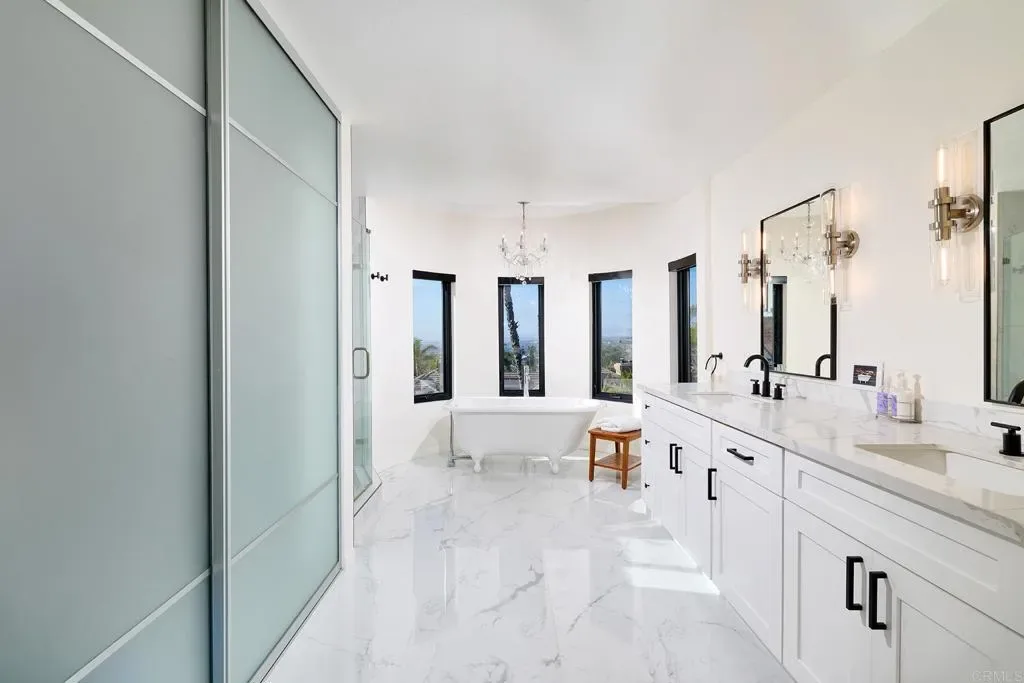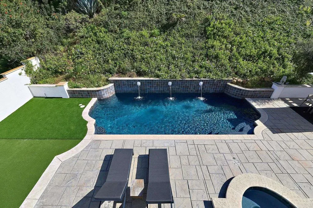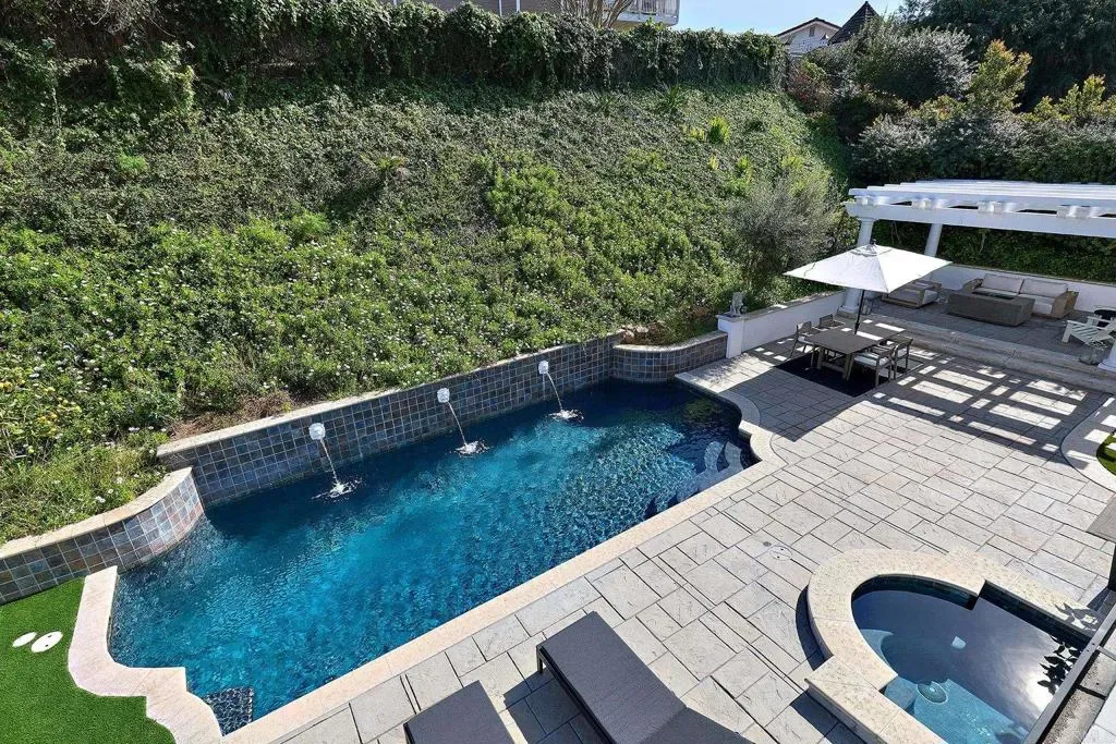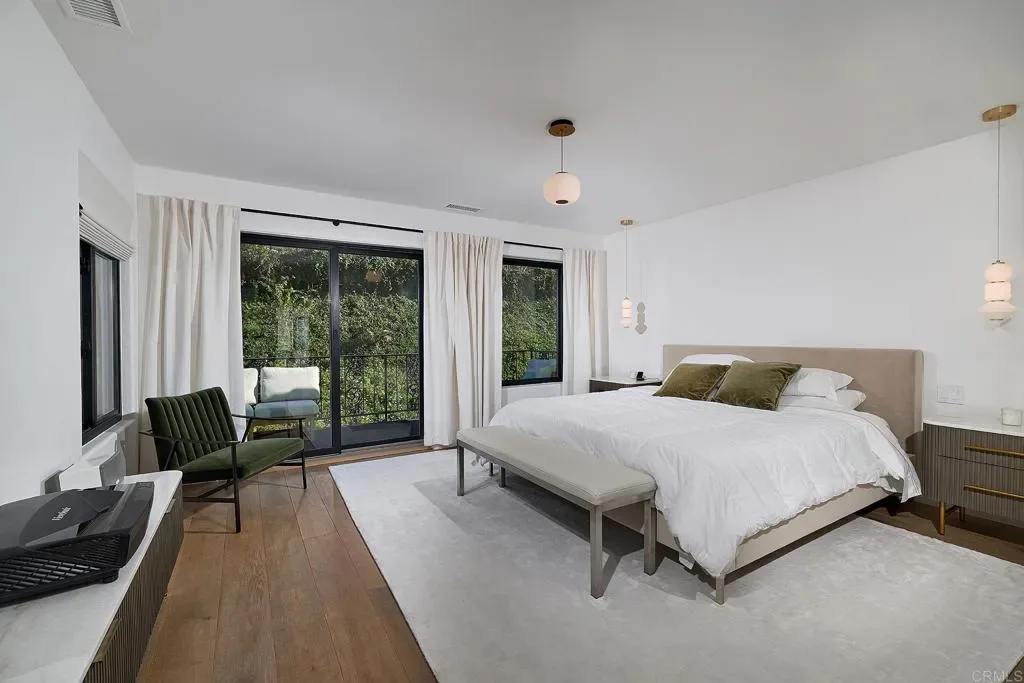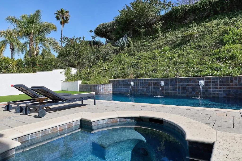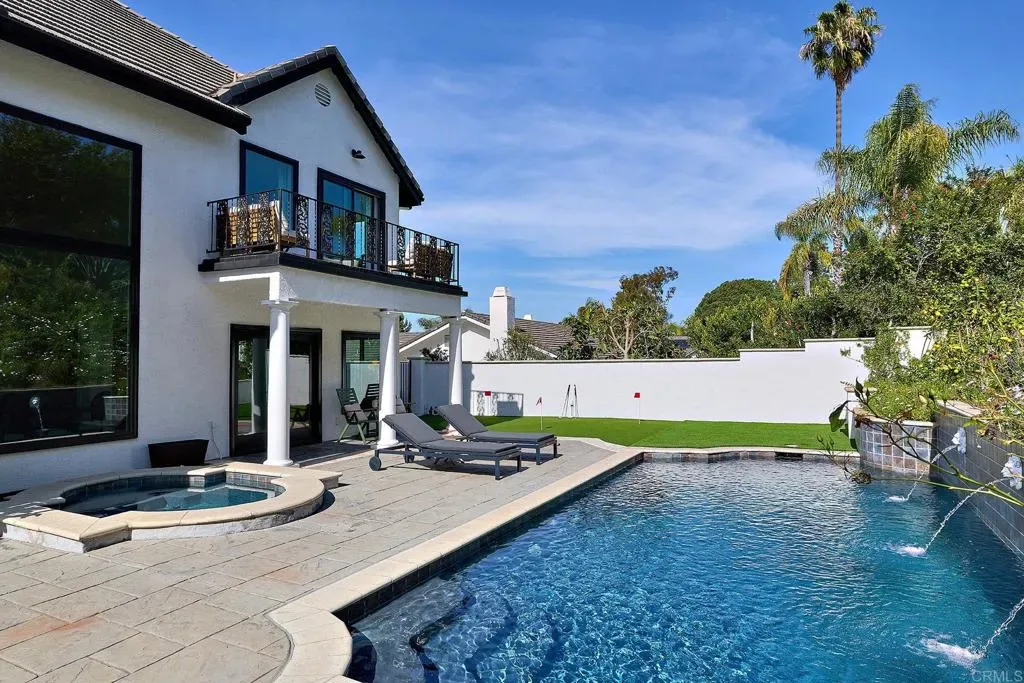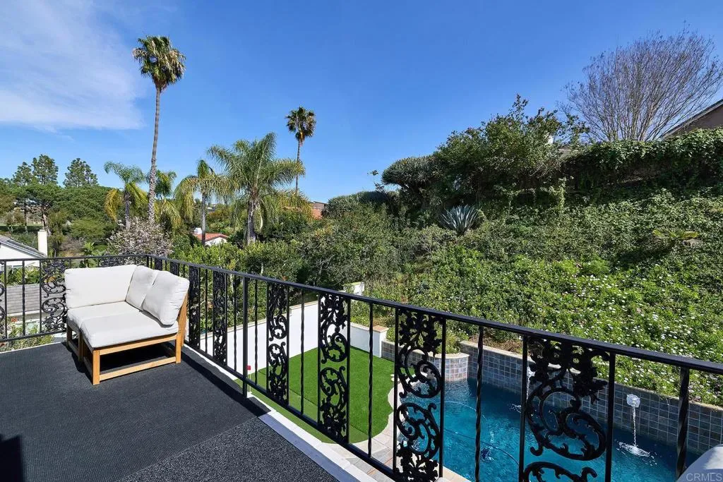 Give yourself a gift and watch your body and mind take a break from the world as you enjoy the sanctity and beauty of your 5-bedroom/4bath private country club. Situated on a hill in the sought after hamlet of La Costa Estates overlooking the city of Carlsbad and a view of the Pacific Ocean. Only a short 15-minute drive to the beach or 24-minute bike ride. Your very private garden patio of fruit trees and wildflowers will start your transition. Take a dip or do your morning laps in our beautiful heated pool or soak those muscles in our outdoor hot tub, day or night. Putt around on your 3-hole putting green and then warm up around your fire pit and listen to the sound of the crackling fire and variety of birds. For your weekend festivities don’t forget lighting up your Chargrill grill smoker for amazing cookouts or your gas fired outdoor pizza oven for homemade pizza’s-we supply the special 00 flour imported from Italy. Inside your newly renovated majestic home you enter through an 8 ft glass pivot door that leads to an elegant curved wrought iron staircase. We start on the first floor your cook’s kitchen fully equipped with a double oven, gas stovetop and professional Vent-a-hood for when you sear a steak. A large natural stone island for prep and seating with more than enough storage underneath and a spacious walk-in pantry. A kitchen slider window that fully opens up to the patio for easy access to your poolside outdoor dining. Adjoining the kitchen is a TV room den so you can keep an eye on your cooking while watching a cooking show, mounted above one of your three fireplaces. Next to the den, a laundry room with a convenient laundry chute from the second floor, and a full bathroom and shower for entry from the pool or beach. Adjacent is entry to your 2-car garage which has a new tankless water heater, an additional standard size refrigerator for food storage and an electric car charger. We provide beach supplies including boogie boards, beach umbrella, beach chairs and a portable grill. Walk to the next room you will be in the dining room with a 12’ picture window that brings in the morning sun and the views of your beautiful garden and pool. Moving along on this floor you step down in to the living room with the 2nd fireplace and a lovely seating area next to picture windows of your putting green and fruit trees. The main floor also has a sun-drenched office or can be used as an extra bedroom. On the 2nd floor, adjacent to the beautifully designed secondary bedrooms with a Hollywood Jack-n-Jill bath and walk-in closets is a fully equipped mirrored fitness room with stationary bike, treadmill, free weights, workout bench and a speed bag. The next room is the “ginormous” 16ft vaulted ceiling Game Room with foosball, card table, closeup 4K projector with built in streaming apps and a 100” viewing screen. A heated massage chair is also provided, a mini fridge, espresso and pod coffee machine, wine cooler and microwave so you don’t have to leave the room during the big game or your favorite series. The “OMG” of this room are the oversize picture windows and wireless controlled shades that close to watch your shows or open up to incredible vistas of the Pacific Ocean and a majestic mountain range. If you are an airport aficionado, you can watch planes take off and land at the distant Palomar airport. Next, you go through the French doors to the primary bedroom suite. This large suite includes privacy power shaded windows, marble tiled floor, standalone large shower, pedestal bathtub with vista windows, a double vanity and wardrobe closet. In the primary bedroom you walk past another fireplace and large walk-in closet to the king size bed and a projector with amazon firestick for streaming all your shows. Open the sliding French door and walk out to a beautiful terrace sitting area overlooking your patio. Enjoy your morning coffee, watch the hummingbirds do their dance among the fruit trees and flowers as the sun rises.