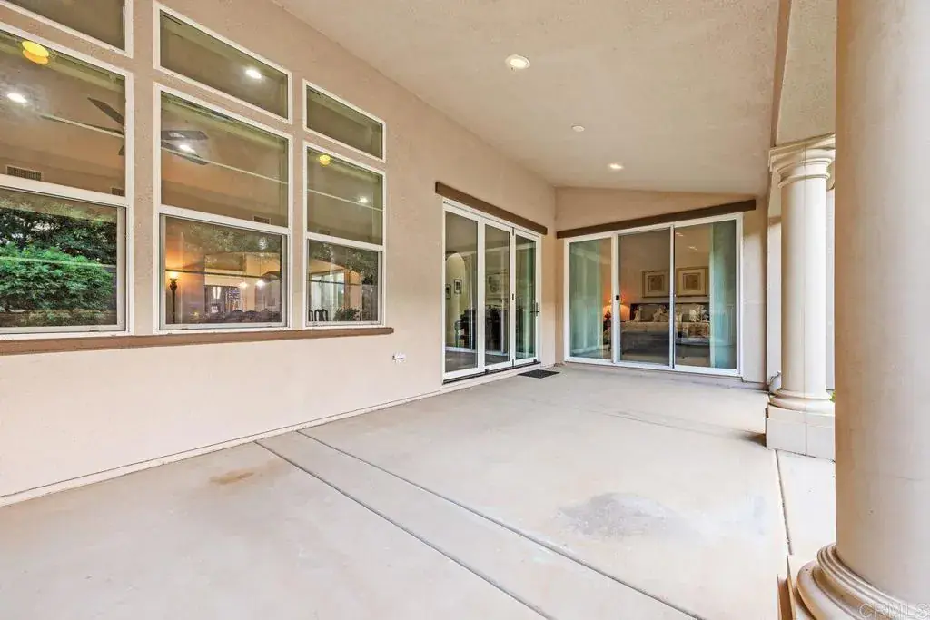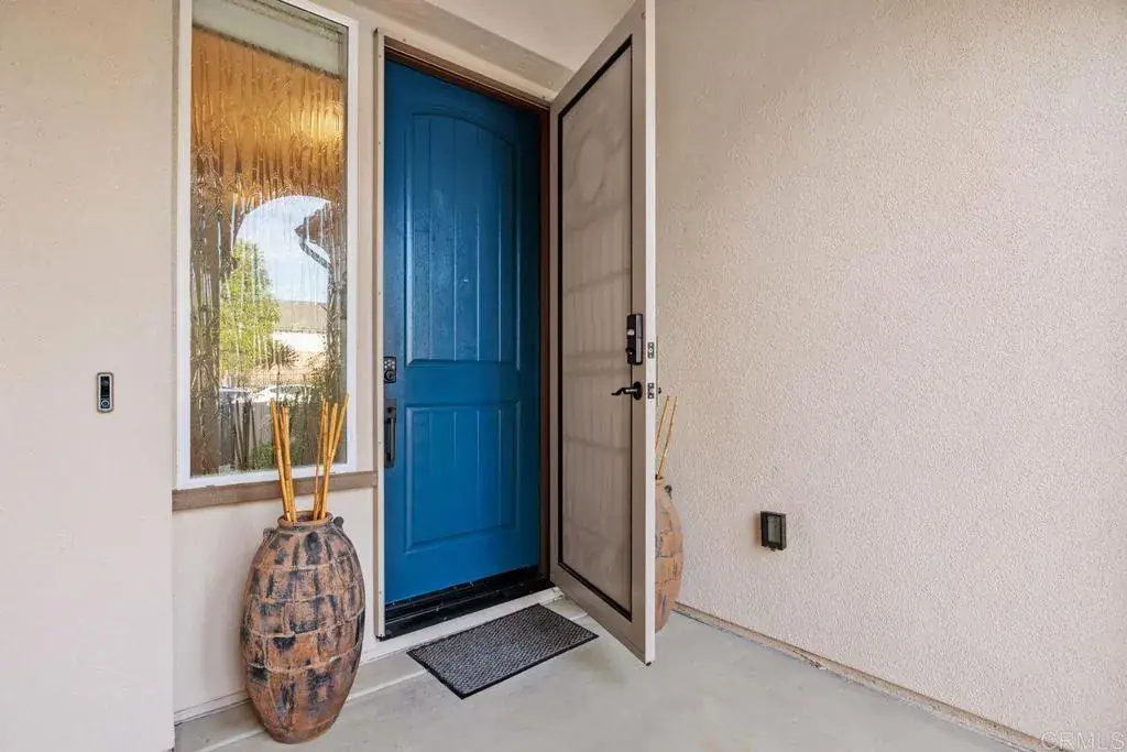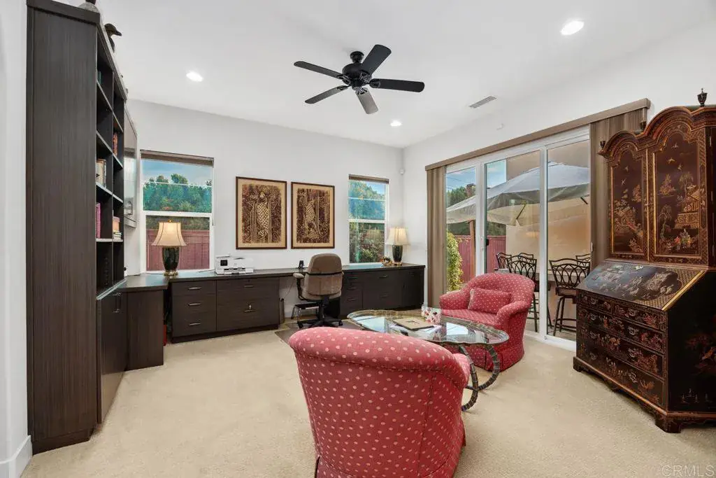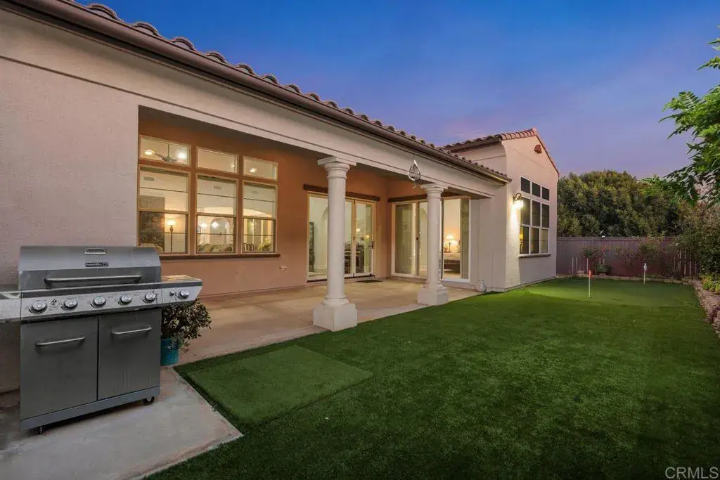 Nestled within the highly sought after Enclave community of West Carlsbad, this beautifully appointed single-story residence offers a rare blend of privacy, sophistication, and coastal convenience. Positioned behind a charming gated courtyard, the home immediately impresses with refined curb appeal and a welcoming sense of arrival. Just minutes from the heart of Carlsbad Village, residents enjoy effortless access to acclaimed dining, boutique shopping, the Coaster train, beaches, and the relaxed surf culture that defines this vibrant coastal community. Inside, rich dark wood flooring flows throughout the main living spaces, complemented by abundant natural light and volume ceilings that enhance the open, airy feel. The thoughtfully designed floor plan creates seamless transitions from room to room, ideal for both everyday living and entertaining. Off the formal entry, a versatile den furnished with built-in desks, cabinetry, and shelves to add function and style. The den is well lit with access to the central courtyard, where a gas fire dining table creates an inviting setting for work, gatherings, or evening relaxation. The kitchen serves as the heart of the home, featuring classic white cabinetry, granite countertops with glass tile backsplash, a farmhouse sink, and a spacious center island with bar seating. Stainless steel appliances, a walk-in pantry, and custom pull-out shelving offer exceptional functionality for the home chef. The adjacent living area is anchored by a gas fireplace with built-in cabinetry and flows effortlessly into the dining space, all framed by expansive windows and folding doors. The primary suite is a true retreat, offering a spa-inspired bath, an expansive walk-in closet with custom organizers, and private access to the covered patio. Two additional ensuite bedrooms, a well-appointed laundry room, and a powder bath provide comfort and flexibility for guests and family alike. Outdoors, the covered patio with gas fireplace extends the living space year-round, while the low-maintenance backyard features a synthetic turf putting green surrounded by mature landscaping for a tranquil, private setting. Additional highlights include HVAC, a 220-volt garage outlet, security system, and low HOA, all located within an award-winning school district close to parks, shopping, and the coast.