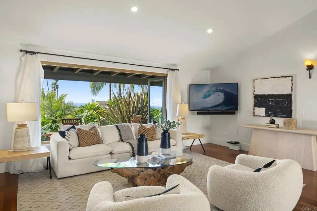 Nestled atop a hill overlooking Olde Carlsbad in the coveted neighborhood of Seacrest Estates, this custom-built masterpiece offers breathtaking PANORAMIC OCEAN views and resides in a tranquil no-through-traffic neighborhood. With 4 bedrooms and 3 baths plus an outdoor shower, the home features unique elegant design throughout. Walking through the door is like walking into a vacation, except, it is home. —-For peace of mind and lower-cost insurance, the home has been rated at the lowest possible risk of fire and flood. See attachment. —-The two-story exterior features ground level and stunning second floor covered porches, New England-style wood siding and trim, a standing seam copper-colored metal roof, artistic exterior lighting, and a broad custom-finished driveway big enough to accommodate several guests. The expansive backyard, with fruiting trees (avocado, orange, lemon, banana, and peach), a top-of-the-line Hot Springs spa, beautiful stone patios, and two Sonos outdoor speaker systems creates a secluded backyard entertainment zone. Situated on a 12,000 square foot lot, well over a quarter acre, there’s ample space for gardening, a playground, or potential additions like a pool or ADU. A fully owned SOLAR PV system delivers significant energy offset to power the home. The attached 2.5 car garage has epoxy flooring and a translucent frosted glass garage door catering to needs for parking and workshops. —-Enter the home though the inviting ground level porch and you will find a first floor showcasing 3 bedrooms and 2 baths, one is a suite with bath ensuite. The living area has an antique beamed cathedral-ceiling with an open-plan kitchen/great room adorned with reclaimed hardwood flooring made from 19th century Indonesian railroad ties, and wood triple-pane Pella windows and sliding door with built-in mini-blinds. Two large La Cantina glass folding doors open to seamlessly merge indoor and outdoor living spaces making entertaining a dream. The spacious crafts room features elongated workspaces with wood and stone counters, ample storage, utility sink and a generous laundry area. An adjacent storage room includes built-in shelving and a cedar closet. A wide, brightly illuminated stairway leads to the second floor. —-The second story provides a generous master bedroom, bathroom, and dressing room suite. A 20-foot long La Cantina door opens the master room onto a covered 380 sq. ft. porch with glass wall and railings that bring stunning sunsets and a 180-degree ocean view to your bedside. Interior highlights continue with tongue-in-groove plank cathedral ceilings, solid oak flooring, and 8-inch baseboards. Luxurious amenities abound, such as an oversized walk-in rain shower with accessories and a 135 sq. ft. wardrobe room complete with custom built-in dressers, shelving, and racking. Additional features include Solatube daylighting, custom lighting fixtures, custom built-ins including a wet bar with beverage center. A stunning floor to ceiling fireplace with beautiful large format tile that warms the room on the occasional chilly night and makes reading and TV time extra cozy. Designed with foresight, the home is pre-wired and framed for a future interior elevator to go from the main level to the second floor. —While secluded and quiet, this home is an easy walking distance to the nearby award-winning middle and high school, and minutes’ drive to beaches and the Carlsbad Village. This one-of-a-kind home epitomizes the Carlsbad coastal lifestyle of relaxation, luxury, and convenience. —Schedule your private showing today to experience all this exceptional property has to offer.