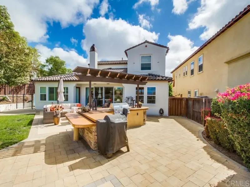 Welcome to this beautifully maintained Spanish-style two-story home offering 4 spacious bedrooms and 3.5 baths, located in a serene neighborhood with picturesque canyon views. Thoughtfully designed for comfort and functionality, the primary suite is conveniently located on the main entry level, providing ease and privacy. Inside, enjoy multiple living spaces including a formal living room, dining room, family room, and a casual breakfast nook adjacent to the kitchen-with high-end appliances. The gourmet kitchen features a central island—perfect for entertaining or everyday meals. A dedicated laundry room with ample built-in storage adds convenience to your daily routine, located on the entry level. Step outside to a backyard made for entertaining—complete with a lush lawn, a peek ocean view, built-in BBQ/bar area, and an expansive patio ideal for gatherings, all overlooking tranquil canyon vistas. The freshly painted exterior enhances the timeless charm of the home’s Spanish architecture. Additional highlights include: fully paid for solar, a 3-car garage, oversized driveway, and dedicated boat/RV parking, offering plenty of space for all your vehicles and toys, plus the community club offers a work out room, a recreation room plus a pool is designated for residents only. This is a rare opportunity to own a spacious, move-in ready home in a quiet, well-kept community close to nature yet minutes from local amenities and only a few strides to the hiking trails.