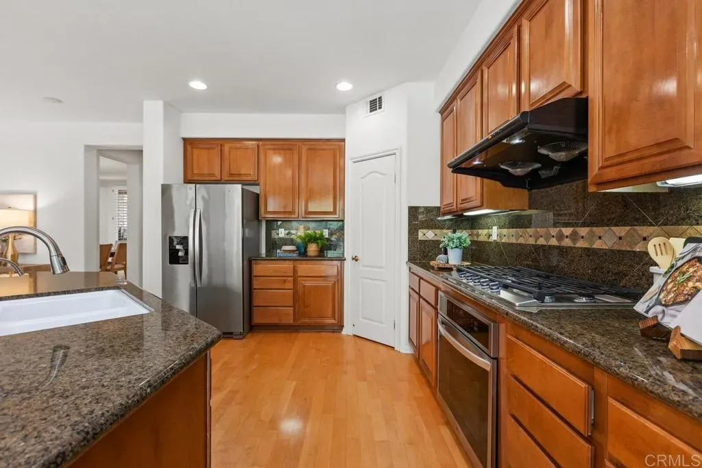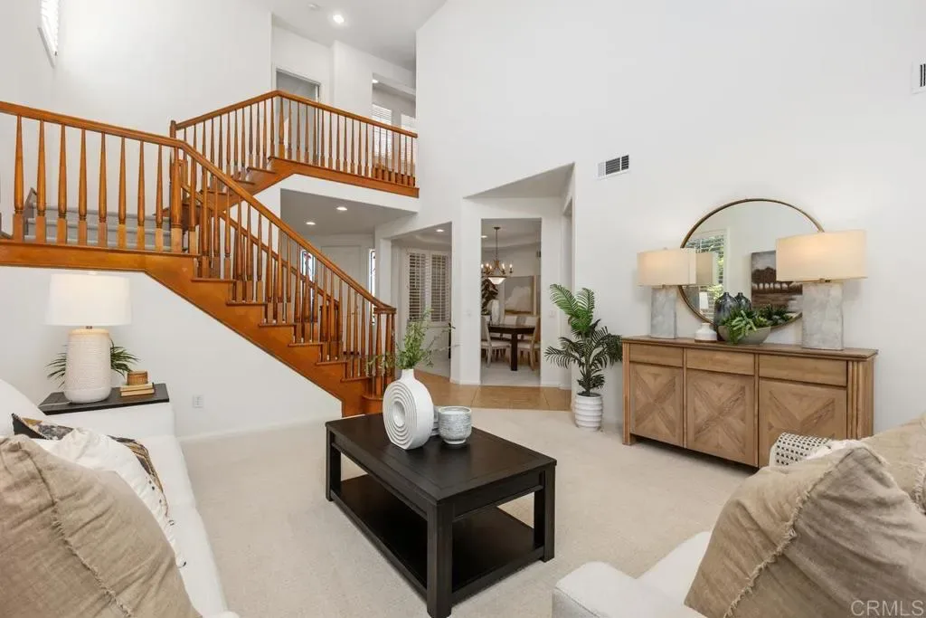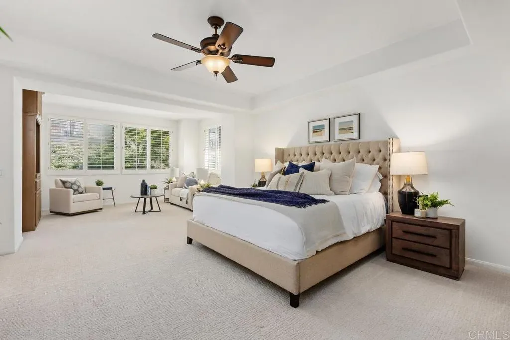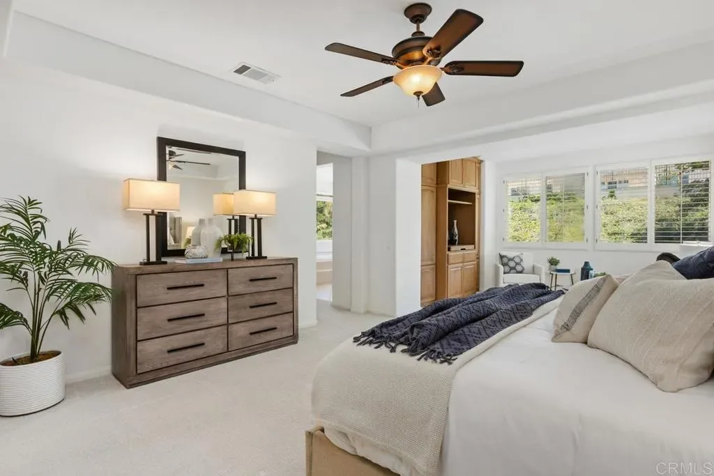 Welcome to this spacious two-story home located in the highly desirable Encantada Community next to Aviara! Property offers 5 bedrooms, 4 bathrooms, a 3-car tandem garage, and a very low HOA! This expansive residence combines comfort, functionality, endless potential, ample storage, and excellent curb appeal. Step inside to vaulted ceilings and abundant windows that fill the home with natural light, enhanced by plantation shutters throughout the main living areas. The thoughtfully designed floor plan offers the perfect space for everyday living and entertaining. The main level features a full bedroom and bathroom, ideal for guests or multigenerational living. The open-concept kitchen seamlessly connects to the family room, complete with a cozy fireplace and built-in cabinetry. Large sliding doors lead to the backyard, which features a BBQ area, patio space, and low-maintenance landscaping. Upstairs, a versatile built-in workstation area provides a convenient space for work or study. The second bedroom includes an en-suite bathroom, while two additional generously sized bedrooms share a Jack-and-Jill bath. The oversized primary suite is a true retreat, featuring a spacious sitting area with built-in cabinetry, a large walk-in closet, and an expansive bathroom with dual vanities, a soaking tub, and a walk-in shower. This home is ready for your personal touches to make it your dream home! Ideally located near shopping, dining, top-rated schools, and with easy freeway access. Come see this house today!