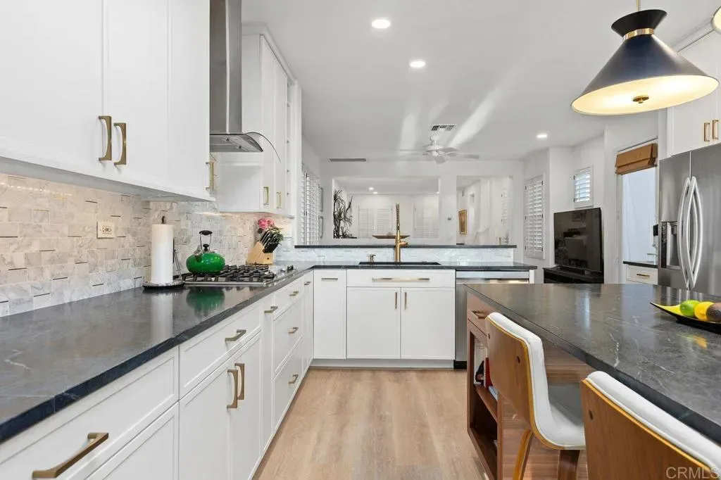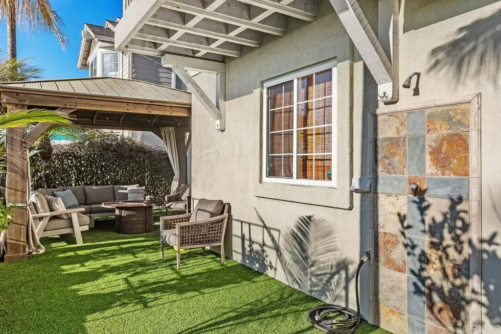 Rarely available oceanfront residence in the coveted Hanover Beach Colony, just steps from Carlsbad State Beach! This beautifully updated three-bedroom coastal home blends refined finishes with effortless beach living. The main level features all-new driftwood plank flooring designed for coastal durability, fresh interior paint, contemporary recessed lighting, and newly installed central A/C. Enjoy the intimate living room with fireplace and adjacent dining room. The redesigned powder room catches the coastal feel with blue floating vanity and marble countertop. The new kitchen showcases custom shaker cabinetry, Brazilian polished soapstone countertops, marble tile backsplash, and under-cabinet lighting. Premium appliances include a double oven with steam, convection and microwave options, five-burner cooktop with cast-iron griddle, and double refrigerator drawers under the coffee bar. A walnut-veneer island with built-in storage and seating for five anchors the space, ideal for everyday living and entertaining. Seamless indoor-outdoor flow leads to the ocean-view patio and professionally landscaped backyard featuring new easy-drain turf, a plumbed BBQ island and fire pit, gazebo with generous seating, solar lighting, and outdoor shower. Upstairs, the primary suite offers a tranquil retreat with a fully renovated spa-inspired bath including a soaking tub, oversized walk-in shower, custom dual vanity, and curated porcelain, slate, Italian tile, and quartz finishes. The secondary bath has also been completely remodeled with a custom French oak vanity, marble flooring, quartz counters, and walk-in shower. Additional highlights include built-in hall storage, an updated laundry room with quartz workspace, and a garage with floor-to-ceiling storage cabinetry. This thoughtfully designed turnkey home is being sold fully furnished! Residents of Hanover Beach Colony enjoy a community pool, volleyball court, parks, and picnic areas, all moments from Ponto Beach, shopping, dining, and the North County Transit District COASTER, offering the ultimate Southern California coastal lifestyle.