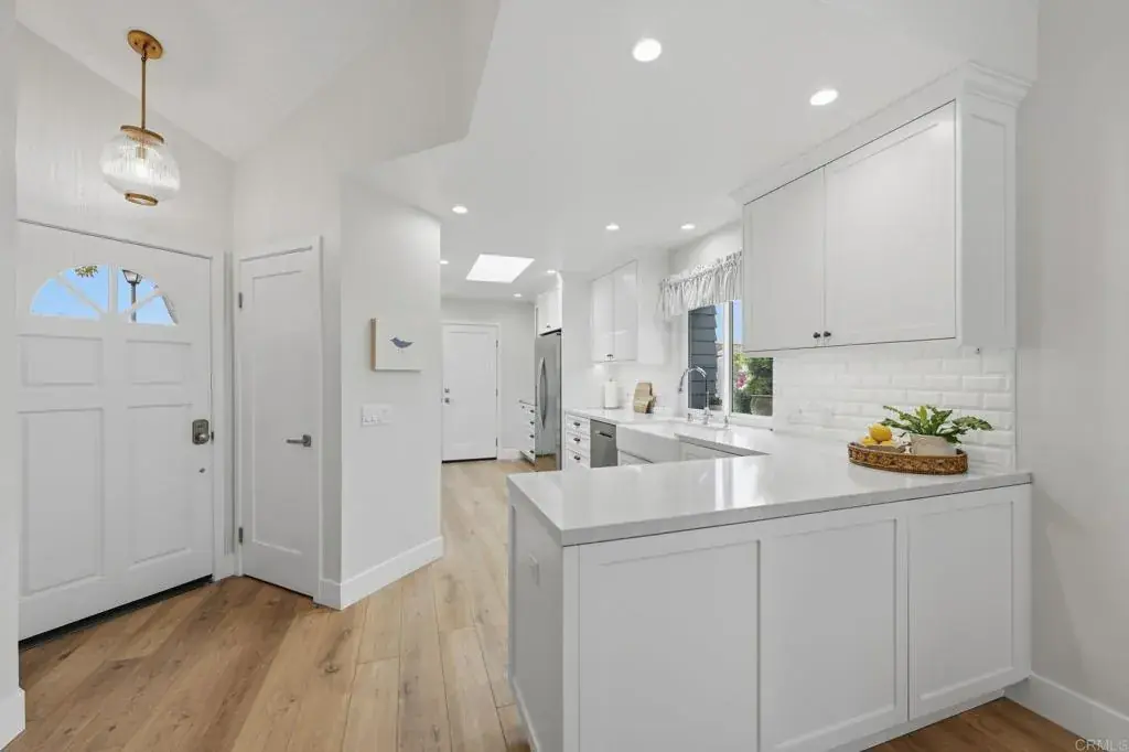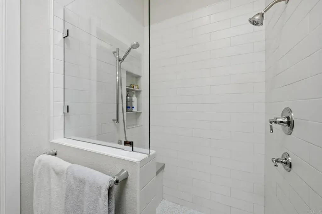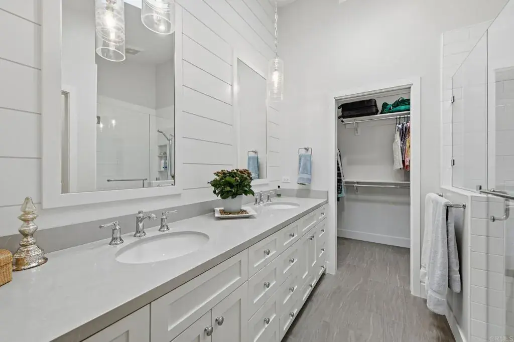 Coastal single-story living at its finest—just minutes from the ocean. Welcome to the highly coveted, gated community of Sea Cliff, where this beautifully upgraded detached single-level 2-bedroom, 2-bath residence is tucked away on a serene cul-de-sac and offers one of the most sought-after features in the community—a generous private driveway that accommodates two cars, a special and authorized convenience. Together, these rare attributes provide exceptional privacy, ease, and everyday functionality, all within a resort-style setting. Soaring ceilings and multiple skylights flood the home with natural light. Custom designer touches are woven throughout the home, with thoughtfully curated finishes, high-end materials, and refined details that elevate every space. The open-concept floor plan is designed for easy living and seamless indoor-outdoor entertaining. The inviting living room features a striking fireplace with decorative fire glass, a stylish shiplap accent wall, and custom built-in cabinetry—creating a warm, coastal-modern ambiance. Multiple sliding glass doors seamlessly connect the interior to a private rear wraparound patio, ideal for morning coffee, al fresco dining, or unwinding after a day at the beach. The chef’s kitchen is a standout, thoughtfully upgraded with high-end stainless-steel appliances including a 36″ Thermador cooktop with center griddle, custom exhaust hood, Thermador convection oven, and Samsung refrigerator and dishwasher. Quartz countertops, a Kohler farmhouse sink, custom cabinetry with a lighted China cabinet, and a Velux Low-E skylight complete this stunning space. Luxury vinyl plank flooring flows throughout, complemented by energy-efficient Milgard windows and patio doors. The serene primary suite features a shiplap accent wall, a beautifully upgraded bath with quartz counters, and a walk-in closet with a conveniently located washer and dryer. The secondary bedroom and guest bath are equally refined, with custom finishes, designer lighting, and thoughtful details throughout. Step outside to your private garden-style patio, surrounded by lush greenery—your own tranquil outdoor retreat for entertaining or relaxation. Residents of Sea Cliff enjoy resort-style amenities, including two pools and spa, tennis courts, a clubhouse, and scenic walking trails that wind around peaceful ponds and streams, all set within impeccably maintained grounds. Single-story homes near the coast in Carlsbad are rare—this is your opportunity to live the lifestyle you’ve been waiting for, with the beach, award-winning schools, top dining, and premier shopping just moments away.