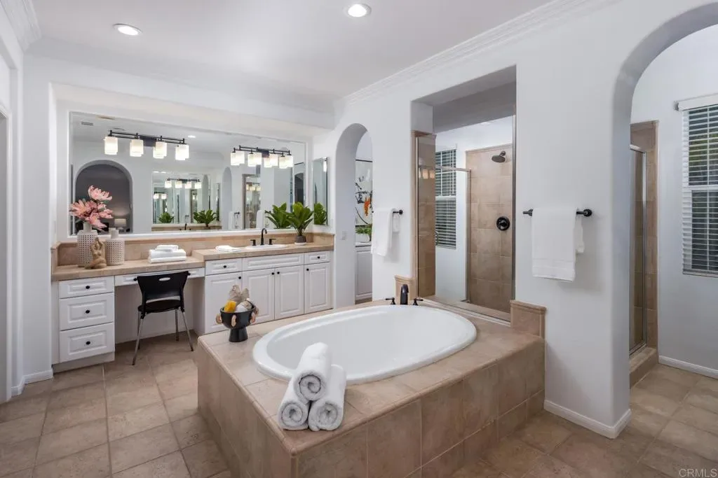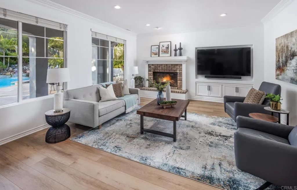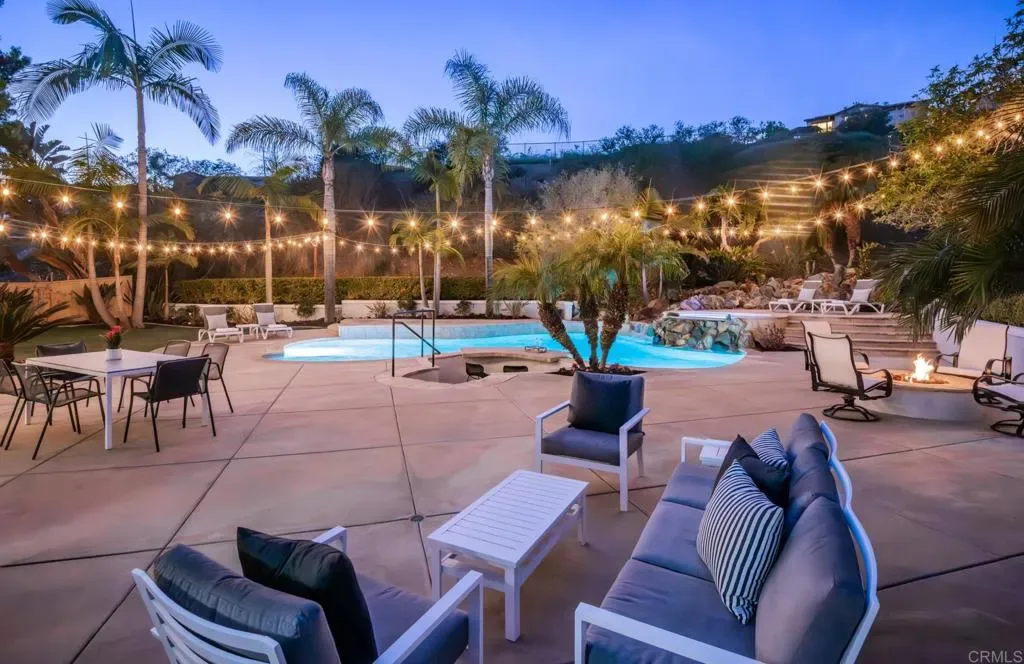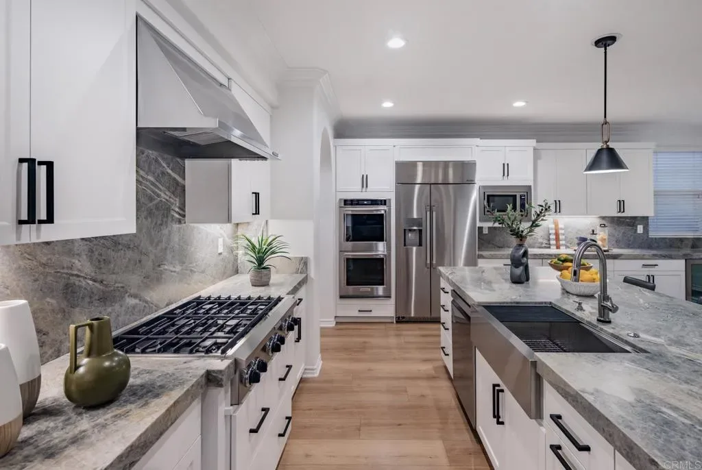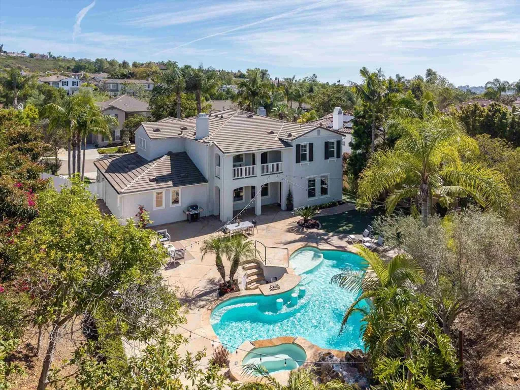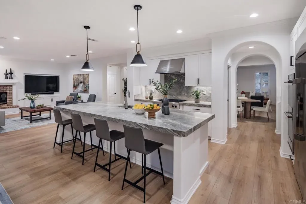 Situated on one of the largest lots in La Costa Oaks South, this exceptional home delivers 4,337 square feet of refined living on a quiet, tree-lined street in one of Carlsbad’s most sought-after communities. The recently remodeled kitchen is the centerpiece of the home, featuring quartzite countertops and matching backsplash, updated cabinetry, a large center island, and premium appliances including a Dacor refrigerator and six-burner gas cooktop. A butler’s pantry, walk-in pantry, and wine closet add exceptional storage and function. Gas fireplaces in both the living room and family room create warm, inviting gathering spaces. The layout offers four generously sized bedrooms and four-and-a-half bathrooms plus an upstairs loft and a flexible downstairs den or office. The four-car garage features epoxy flooring, an EV charger, and custom cabinetry. The backyard is resort-caliber: a saltwater pool with Baja shelf and swim-up bar, an elevated spa with custom waterfall, fire pit, turf lawn, and mature fruit trees including citrus, avocado, fig, and guava. Major updates include a new roof, owned solar, new pool plaster and equipment, new carpet and flooring, whole-house LED lighting, and a new security system. La Costa Oaks residents enjoy proximity to the highly-regarded San Dieguito school district, multiple clubhouses, pools, spas, and a fitness center — minutes from La Costa Town Square, and coastal beaches.