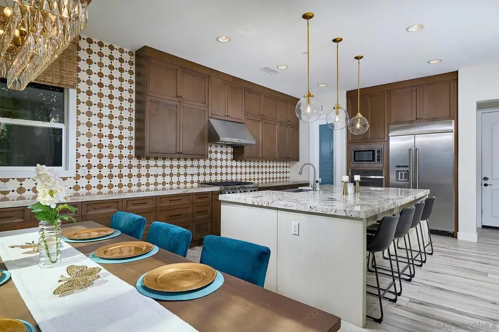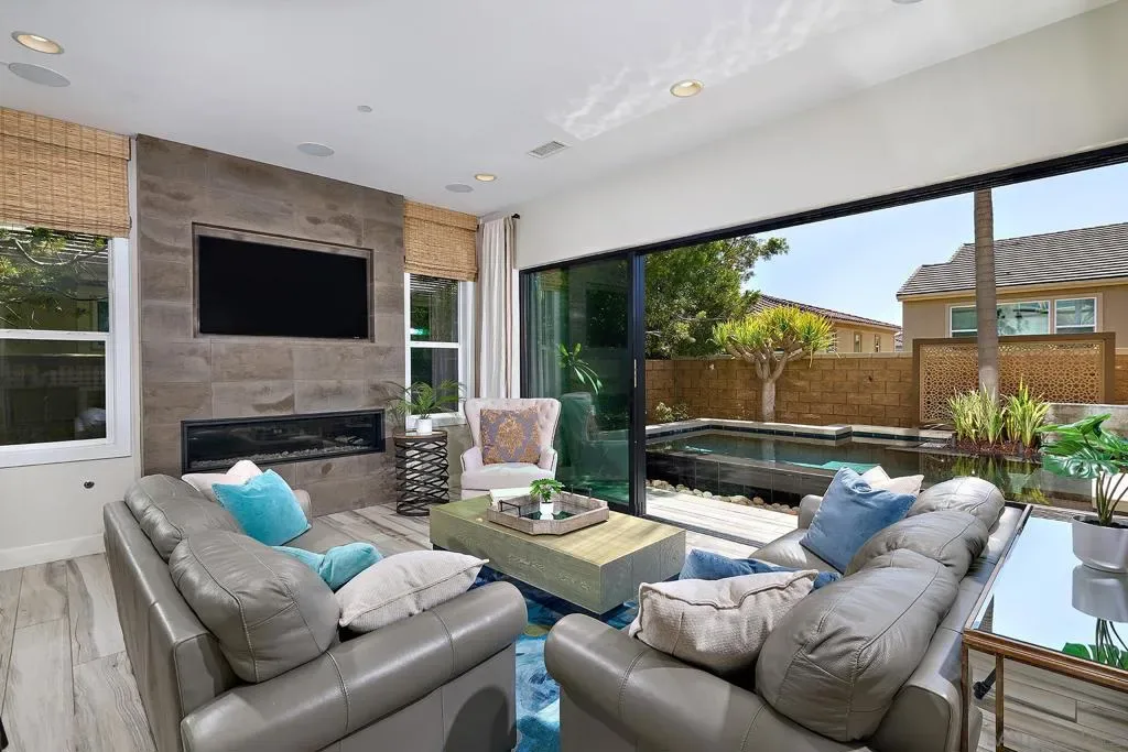 Professionally designed former Toll Brothers model home, situated in desirable Robertson Ranch! This highly upgraded residence showcases exceptional craftsmanship and designer finishes throughout. The open-concept great room features a striking linear fireplace and flows seamlessly through expansive stacking sliding doors to a resort-style backyard, complete with a sparkling pool, loungers, and multiple sitting areas—perfect for indoor/outdoor living and entertaining. Custom built-ins and upgraded flooring enhance every space. A full en-suite bedroom and bath on the first floor provides ideal accommodations for guests or multigenerational living. Upstairs, a spacious bonus room offers flexible entertainment and living options. The primary retreat is thoughtfully positioned at the back of the home for maximum privacy, featuring a luxurious en-suite bath and a custom built-out walk-in closet. Additional upstairs bedrooms each include en-suite baths. Notable upgrades include owned solar, whole-house water softener system, epoxy garage flooring with storage racks, and meticulously maintained, immaculate landscaping. Every detail has been curated to model-home perfection! Residents of Robertson Ranch enjoy five playgrounds, green spaces, and miles of trails for hiking and biking. The exclusive resort-style recreation center features a sparkling pool, spa, kiddie pool, cabanas, outdoor fireplace, BBQ area, & an indoor entertainment space with a full kitchen. Just ten minutes to the beach with easy access to freeways, and located in top rated Carlsbad Unified School District!