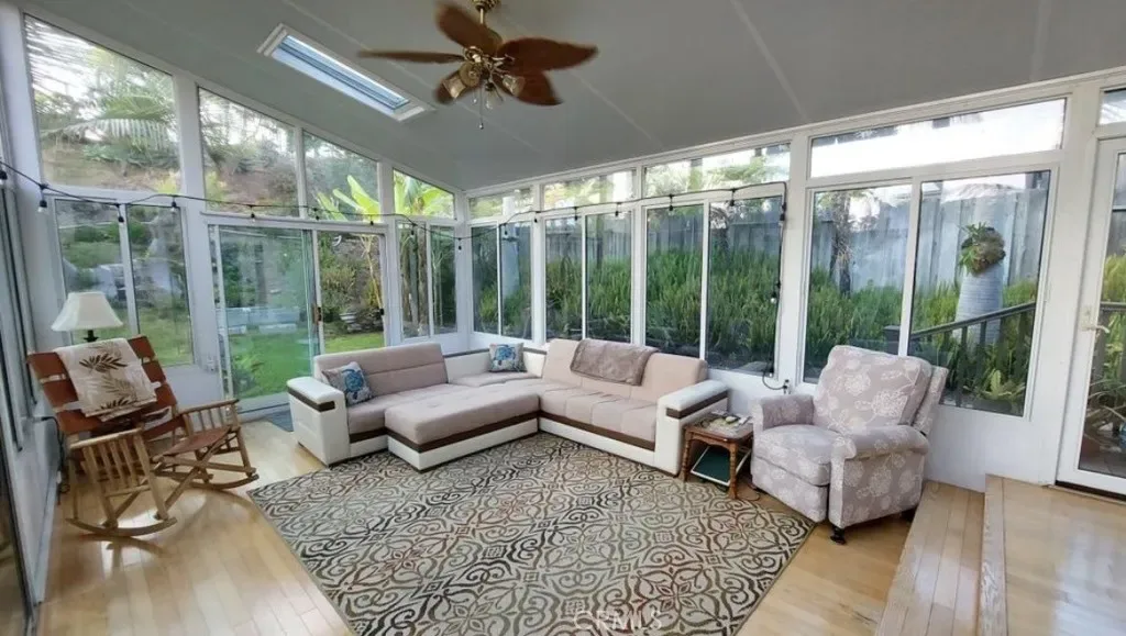 This beautiful 4-bedroom, 3-bathroom tri-level home in a desirable neighborhood in Carlsbad offers easy, living with thoughtful design. Step inside to soaring vaulted ceilings in the welcoming foyer, leading up to an open loft-style family room which has a full length bar for entertaining. The living/dining combination features a cozy gas fireplace with remote control for effortless ambiance. This opens up into a bright sunroom that beautifully frames the tropical backyard oasis. Note: The sunroom’s additional 322sf is not included in livable area. The split level design is ideal for comfortable living without excessive climbing. The primary suite includes a versatile bonus area with a loft bed, desk workspace below, and a convenient sink. Downstairs, the secondary bedroom connects to a permitted bonus room and full bathroom, can be used as an in-law floor plan, guest suite, or junior ADU, complete with a separate side-yard entrance for added privacy. Additional improvements include a newer roof, new system pavers in the driveway, fresh interior paint, a fully paid solar system for energy savings, whole house Halo water system and an electric car charging outlet in the garage. Enjoy outdoor living on the 200 sq ft deck off the family room, with stairs leading directly to the lush, gardener’s paradise backyard. This tropical retreat boasts mature palm trees and an impressive array of fruit trees. Additional backyard highlights include a charming shed combo with an upper deck, playhouse, and slide—perfect for extra storage. Nestled in popular Laguna Riviera—a no-HOA community with a true neighborhood feel—this home is just blocks from the scenic Agua Hedionda Lagoon for water sports and relaxing, and close to highly rated Kelly Elementary School. A rare blend of space, functionality, sustainability, and tropical outdoor living.