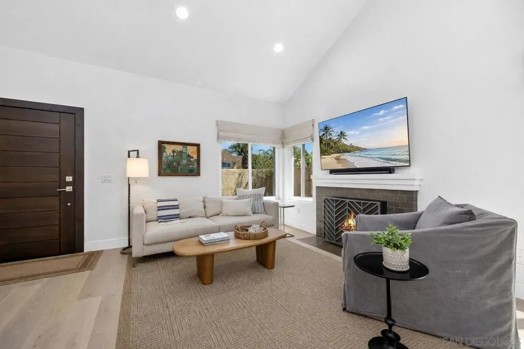 Stunning, turn-key home with breathtaking panoramic ocean views. From the moment you arrive, you’re welcomed by a private enclosed front patio—perfect for morning coffee, soaking in the coastal air, or winding down at sunset. Step inside to an abundance of natural light, soaring vaulted ceilings, and a cozy fireplace that instantly makes the space feel like home. This beautifully updated property features recently updated white oak engineered hardwood floors throughout, along with newly upgraded stairs and railing, creating a clean, modern feel from top to bottom. The recently remodeled designer kitchen is a true showpiece, complete with Calacatta Izaro quartz countertops, a handcrafted zellige tile backsplash, GE Café appliances, a walk-in pantry, and a warm butcher block island—plus ample storage throughout. A new kitchen slider enhances indoor-outdoor flow, making it easy to step out and enjoy the view. The spacious primary suite is conveniently located on the first floorl, offering ocean views and direct access to the backyard—ideal for quiet mornings or catching those year-round sunset views. It also features a generous walk-in closet for added comfort and functionality. Upstairs, you’ll find three bedrooms, with the third easily functioning as either a bedroom or a home office—all enjoying those same incredible ocean views. The elevated positioning of the home creates an open, airy feel in the backyard—perfect for taking in the sky views and even starry nights. Step outside to a private backyard designed for entertaining, featuring a canvas-covered lounge area and market lights that create a relaxed, coastal vibe. The surrounding hardscape expands the usable outdoor living space, making it ideal for hosting or simply enjoying San Diego’s year-round weather. The spacious two-car garage includes laundry, built-in storage, attic access, and a finished epoxy-coated floor—offering plenty of functional space for storage and organization. Located in a prime North County coastal location with easy access to the 5 and 101, you’re just minutes from everything. Enjoy direct access to South Carlsbad State Beach just down the hill, plus nearby access to South Ponto Beach, Batiquitos Lagoon hiking trails, and Poinsettia Park with its popular dog park. The nearby Camp Store adds a fun local touch with live music, food, and a laid-back beach vibe. Residents also enjoy access to resort-style amenities including a pool, spa, and tennis courts—all with low HOA fees.