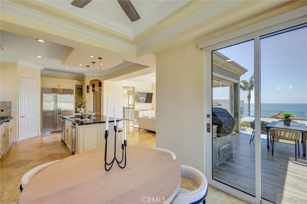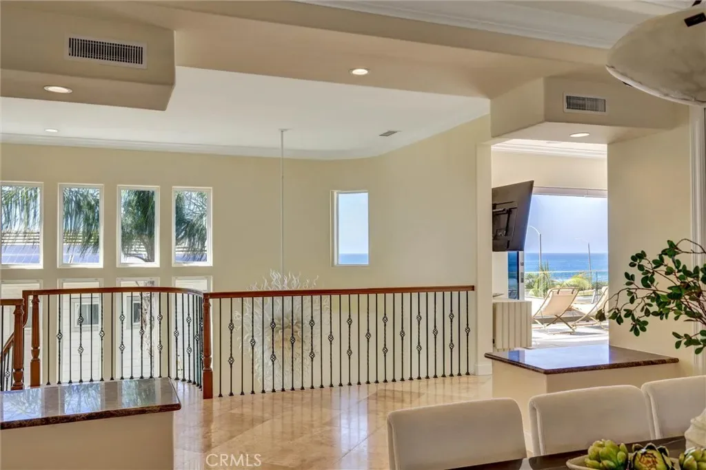 The open-concept floor plan, including ocean views inside and out with glass railings, features a chef’s kitchen equipped with Wolf and Sub-Zero appliances, custom cabinetry, and an oversized island that opens to expansive living and dining areas—ideal for both entertaining and everyday living. Perfect for large families or entertaining.