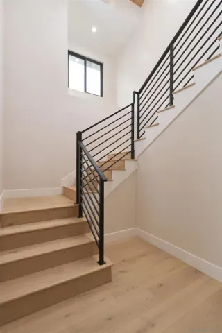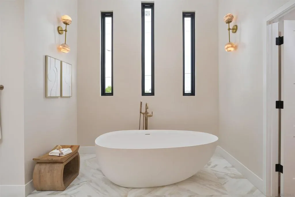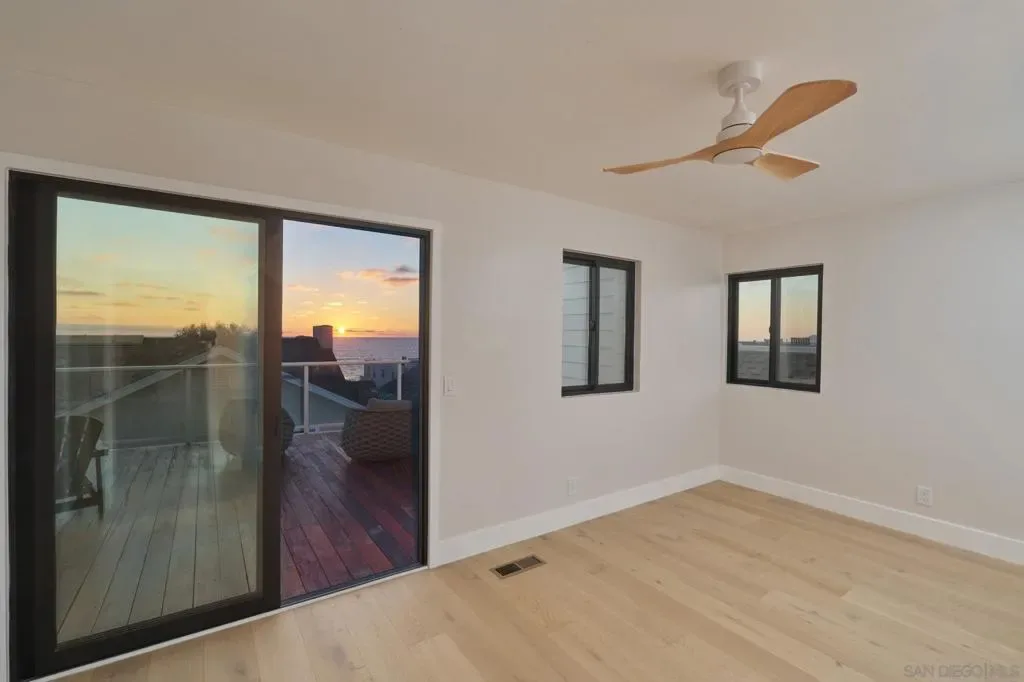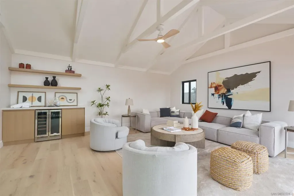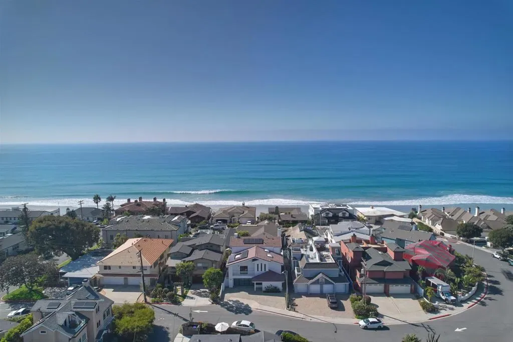 Fully remodeled coastal home just blocks from the beach and Carlsbad Village, offering ocean views, a rooftop deck, and luxury finishes throughout. Completely reimagined from top to bottom, this turnkey residence blends modern design with effortless indoor-outdoor living. The chef’s kitchen anchors the main level with a waterfall-edge quartzite island and a full suite of Viking appliances, including a built-in refrigerator and dual-oven 8-burner range. Custom cabinetry, Delta fixtures, and Fleetwood sliding doors bring in natural light and open seamlessly to the living and dining areas featuring engineered hardwood floors, a sleek fireplace, and built-in bar with wine fridge. Two first-floor bedrooms each include private en suite baths—ideal for guests or flexible living. Upstairs, the primary suite offers a vaulted wood-clad ceiling with skylight, spa-inspired bath with soaking tub, oversized walk-in shower, quartzite counters, and a custom walk-in closet. A finished bonus room provides additional flexible space. All four bedrooms feature en suite baths with designer finishes. Additional upgrades include Anderson Fiberx windows and a new multi-zone HVAC system. The upper-level entertaining room showcases vaulted ceilings, expansive glass doors, and ocean views, opening to a 600+ sq ft deck—perfect for sunset gatherings above the Pacific.