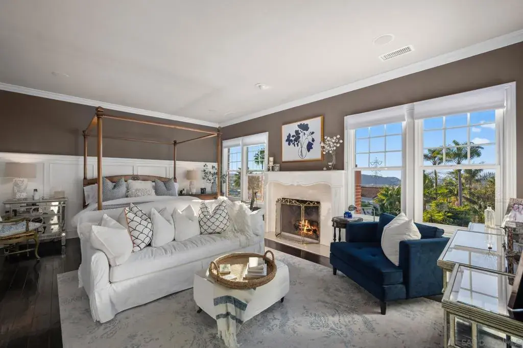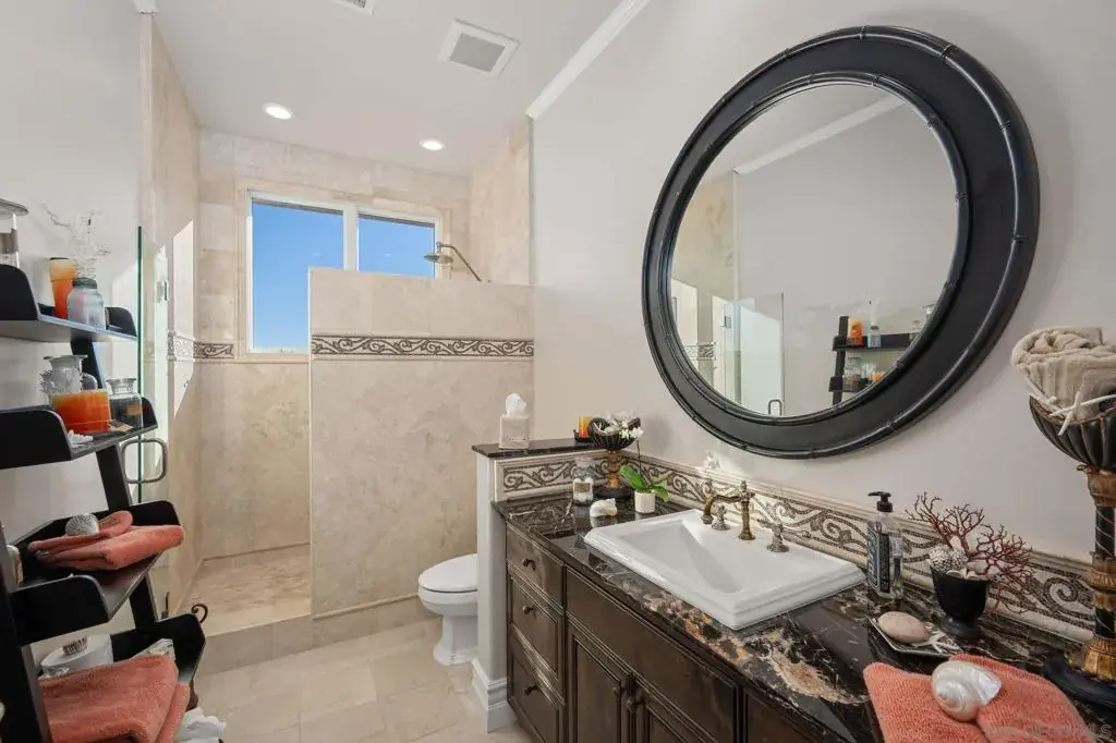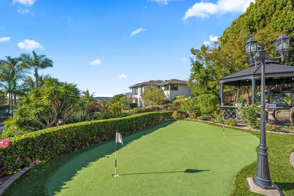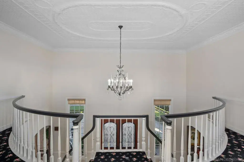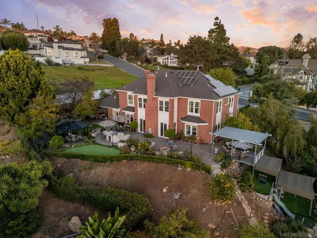 Perched in Carlsbad’s prestigious La Costa Estates, 2915 Managua Place epitomizes refined coastal living. This 4,792 sq. ft. brick estate sits on a half-acre of manicured grounds with panoramic ocean and La Costa Golf Course views, offering an elegant backdrop for everyday life. Enter through grand double doors into a dramatic two-story foyer, where twin staircases curve beneath a hand-tin ceiling and crystal chandelier. Thoughtful craftsmanship is evident throughout, with oak and travertine floors, crown molding, and solid doors accented by brass hardware. The gourmet kitchen anchors the home with a Wolf range, Miele coffee system, imported French limestone counters, and custom Villeroy & Boch sink. Nearby, the dining room radiates warmth and sophistication with Venetian plaster ceilings, cloth-paneled walls, and a travertine fireplace. The primary suite is a serene retreat with tranquil ocean and golf course vistas, a spa-inspired bath featuring an Oceana soaking tub, Toto toilet, and expansive walk-in closet with dressing room. Outdoors, the property lives like a private resort—complete with a rose garden, outdoor kitchen with BBQ and bar, a covered deck for sunset views, and a turf recreation area. The fruit orchard—bearing lemons, limes, oranges, and avocados—adds charm and sustainability. Modern upgrades enhance its timeless appeal, including solar panels, newer windows, a Lennox smart climate system, a whole-house water softener. 2915 Managua Pl. offers a blend of craftsmanship, comfort, and coastal beauty moments from the Pacific Ocean and beaches.