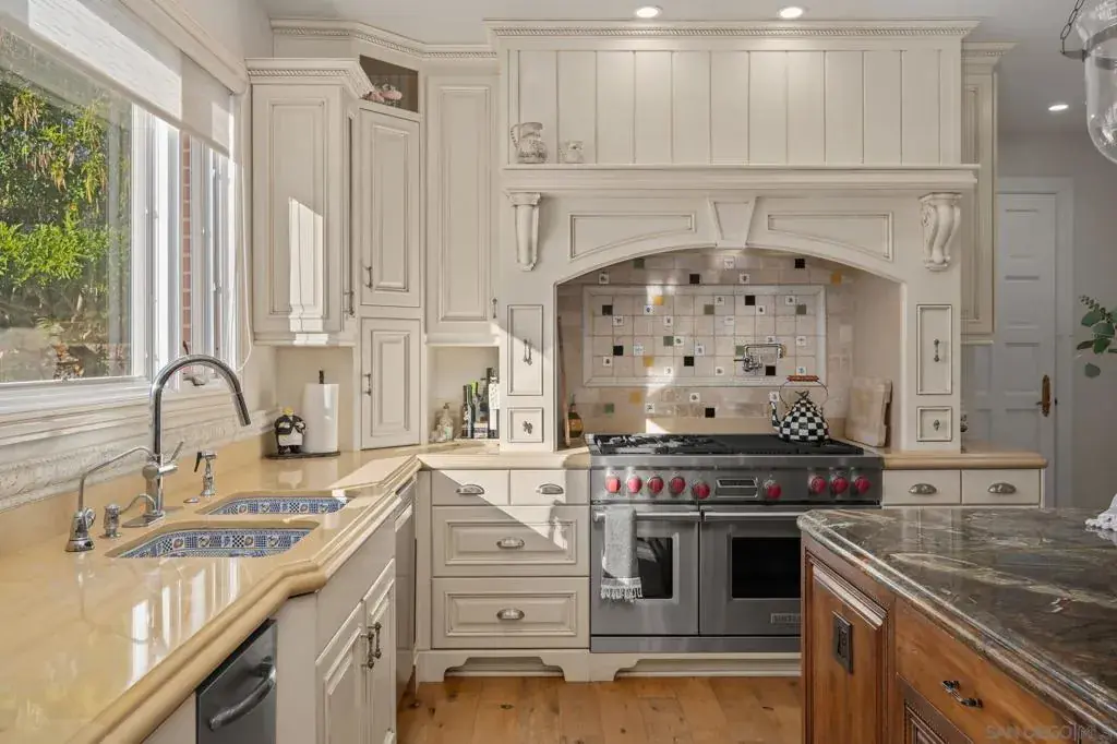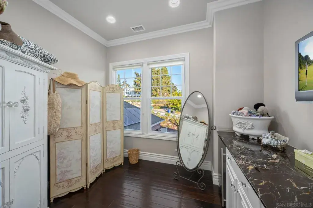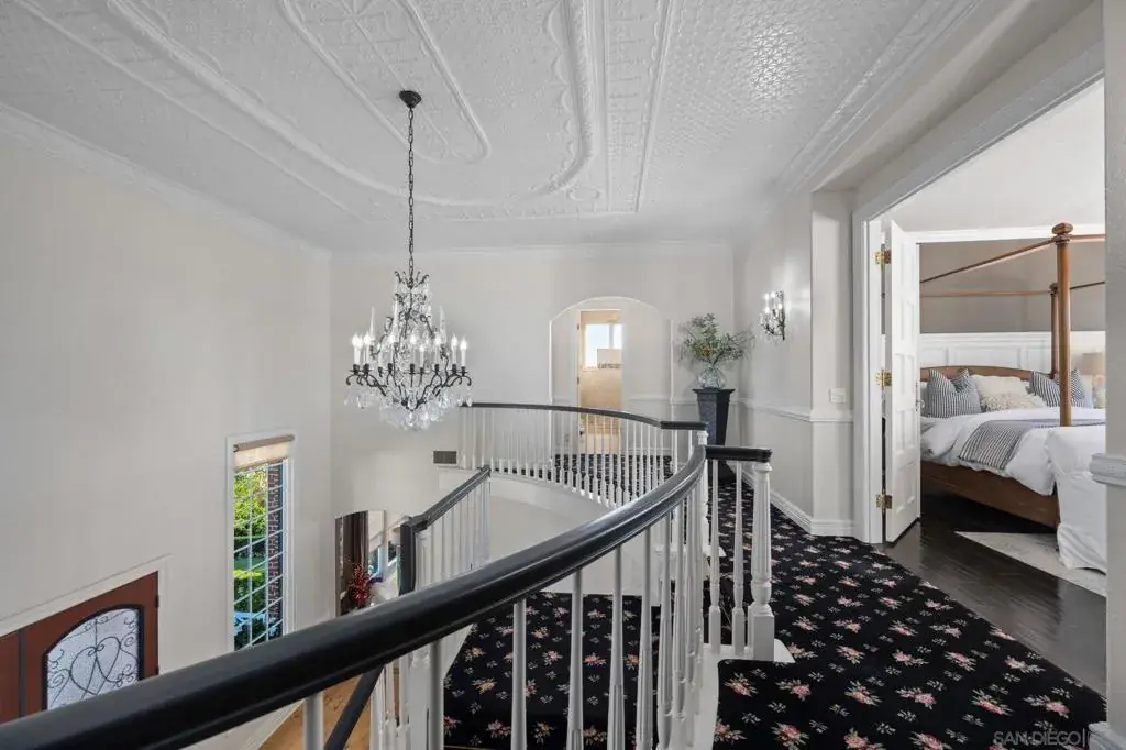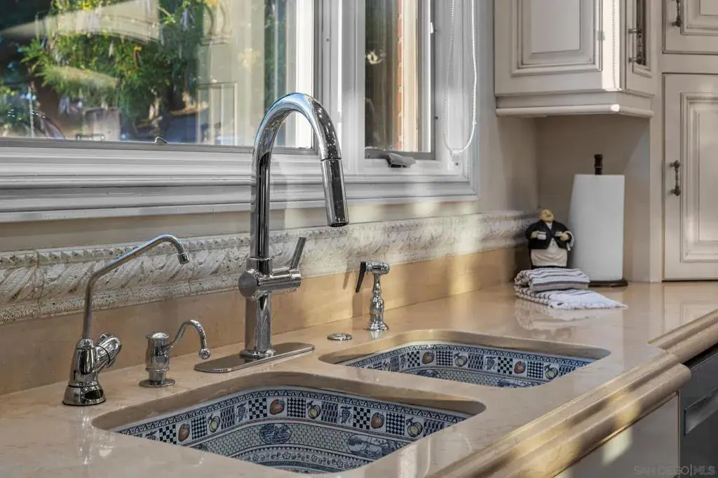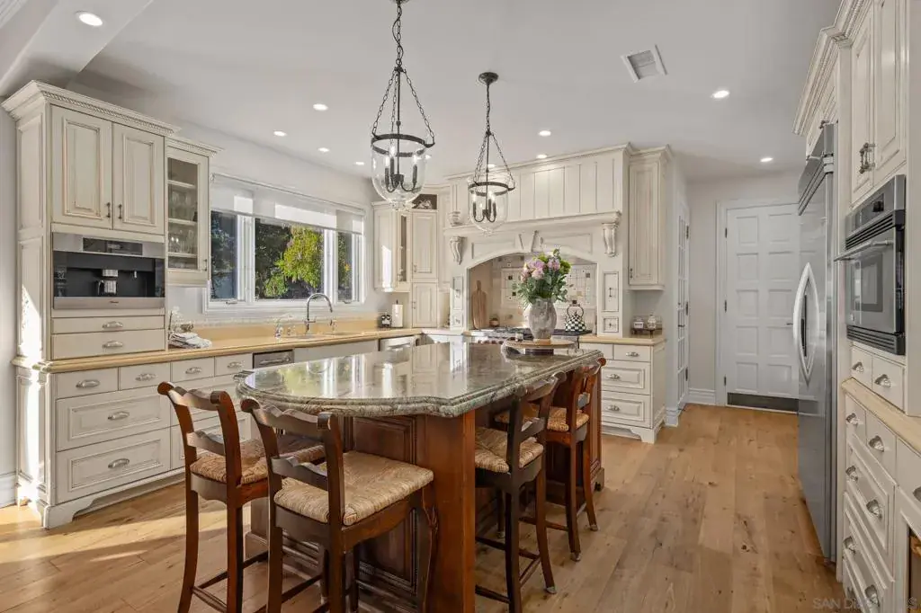 Perched in Carlsbad’s prestigious La Costa Estates, 2915 Managua Place epitomizes refined coastal living. This 4,792 sq. ft. brick estate sits on a half-acre of manicured grounds with panoramic ocean and La Costa Golf Course views, offering an elegant backdrop for everyday life. Enter through grand double doors into a dramatic two-story foyer, where twin staircases curve beneath a hand-tin ceiling and crystal chandelier. Thoughtful craftsmanship is evident throughout, with oak and travertine floors, crown molding, and solid doors accented by brass hardware. The gourmet kitchen anchors the home with a Wolf range, Miele coffee system, imported French limestone counters, and custom Villeroy & Boch sink. Nearby, the dining room radiates warmth and sophistication with Venetian plaster ceilings, cloth-paneled walls, and a travertine fireplace. The primary suite is a serene retreat with tranquil ocean and golf course vistas, a spa-inspired bath featuring an Oceana soaking tub, Toto toilet, and expansive walk-in closet with dressing room. Outdoors, the property lives like a private resort—complete with a rose garden, outdoor kitchen with BBQ and bar, a covered deck for sunset views, and a turf recreation area. The fruit orchard—bearing lemons, limes, oranges, and avocados—adds charm and sustainability. Modern upgrades enhance its timeless appeal, including solar panels, newer windows, a Lennox smart climate system, a whole-house water softener. 2915 Managua Pl. offers a blend of craftsmanship, comfort, and coastal beauty moments from the Pacific Ocean and beaches.