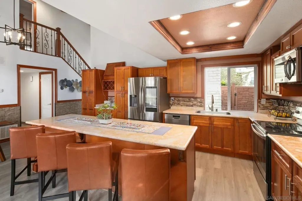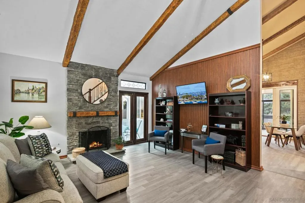 Situated within one of Carlsbad’s most desirable La Costa neighborhoods, this beautifully upgraded residence offers a rare blend of thoughtful design, timeless finishes, and exceptional indoor-outdoor living. The home welcomes you with striking curb appeal enhanced by mature landscaping, new exterior lighting, a stone-accented façade, custom retaining walls, upgraded fencing, and an inviting covered entry. Inside, refined architectural details create a warm yet elevated atmosphere, including faux wood beams, stacked stone and WPC accent walls, upgraded staircase and treads, plantation shutters, and luxury vinyl plank flooring throughout. The chef’s kitchen serves as the heart of the home, showcasing rich cherry wood cabinetry, marble countertops, a generous island with breakfast bar seating, stainless steel appliances, designer tile backsplash, mural tile wine rack, touchless faucet, and stylish new lighting fixtures including chandeliers in the foyer and dining room. Expansive new windows and French doors fill the home with natural light while seamlessly connecting indoor spaces to the outdoors. Designed for both comfort and entertaining, the property features an impressive approximately 400-square-foot sunroom with a four-panel slider that opens to the beautifully landscaped backyard retreat. Enjoy evenings beside the outdoor fireplace, surrounded by lush greenery, rock features, raised garden beds, and fruit trees including pomegranate, lemon, lime, banana, and loquat. Artificial turf and upgraded irrigation provide easy maintenance while maximizing outdoor enjoyment. The versatile floor plan offers two spacious primary suites with double closets, custom closet systems throughout, and three beautifully updated bathrooms with new glass enclosures. Additional upgrades include plantation shutters, new interior doors and hardware, floor-to-ceiling cabinetry upstairs, a soft water system, a new water heater (2023), and a brand-new roof with a 20-year warranty (2024). Ideally located near top-rated schools, golf, beaches, shopping, and dining, this exceptional La Costa residence delivers a lifestyle defined by comfort, quality, and coastal sophistication.