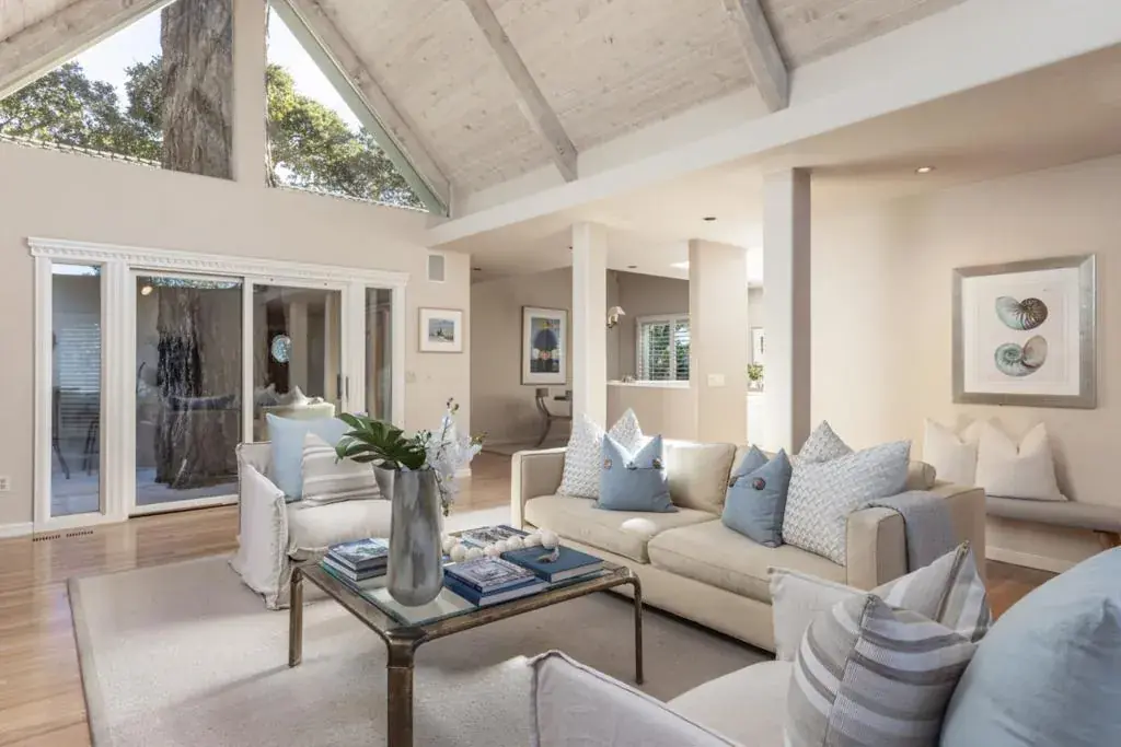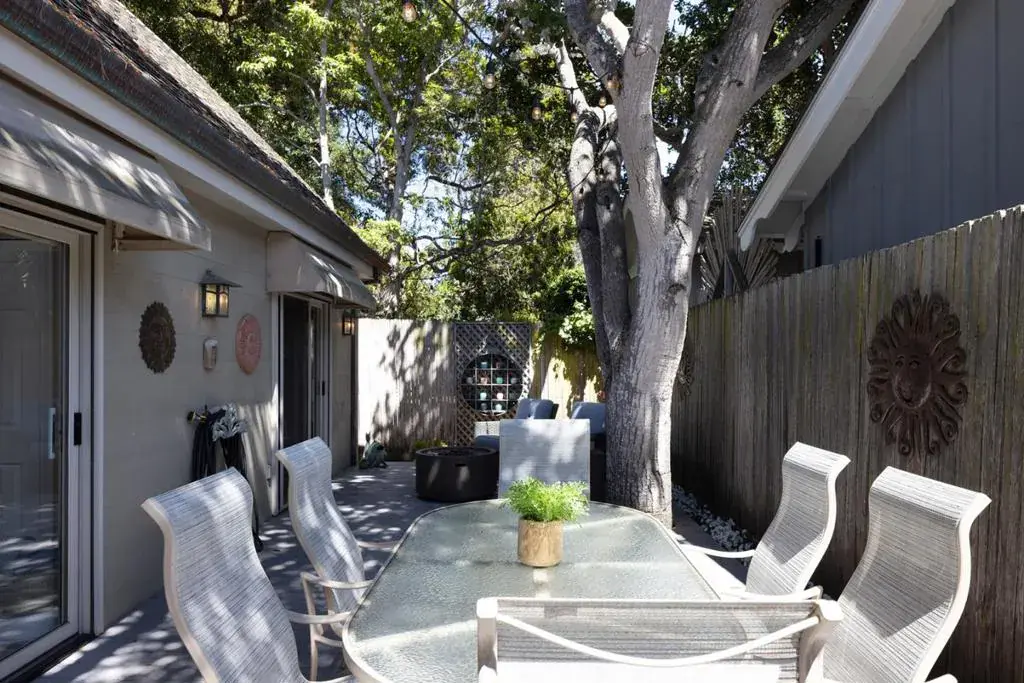 Pardon My Tree sits in Carmel’s coveted Golden Rectangle, offering the rare convenience of a flat stroll to downtown shops, restaurants, and to the beach. Step inside to a warm and inviting living room with a classic Carmel stone fireplace, vaulted wood-beamed ceiling, and expansive windows that bathe the space in natural light. Both bedrooms are generously sized, with plush wool Berber carpet, ample closets, and sliding doors that open to a private deck. Details include hardwood floors, wood shutters, an open kitchen with adjoining dining area and 1 car garage with storage. Outdoors, multiple decks and a Carmel stone patio create serene spaces to enjoy the coastal lifestyle. With its one-level floor plan, meticulous upkeep, and unbeatable location, Pardon My Tree is a quintessential Carmel retreat where every day feels like a vacation and downtown is just a short, easy walk away.