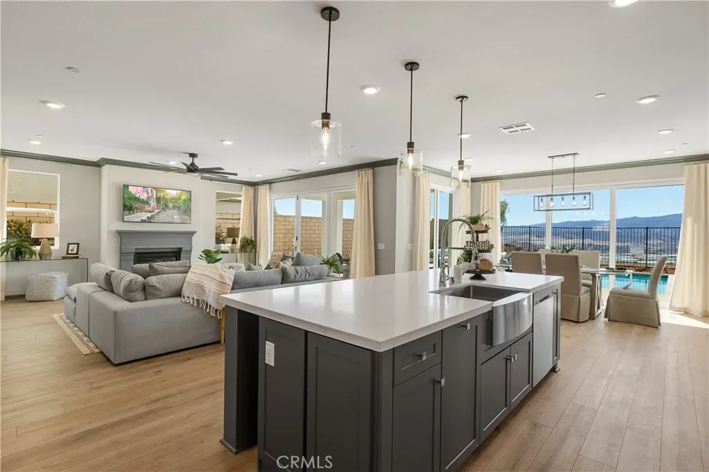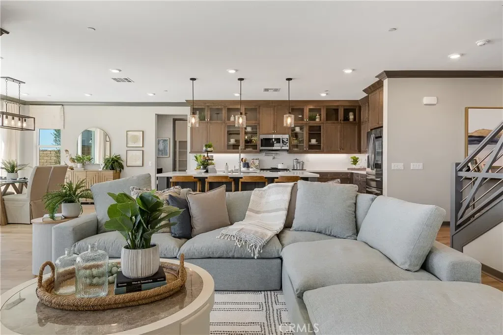 This professionally designed model showcases high-end upgrades and thoughtfully curated finishes throughout. The open-concept layout centers around a stunning great room with a fireplace, creating a warm yet sophisticated focal point for everyday living and entertaining. Large sliding doors enhance the seamless transition to the California Room, extending the living space outdoors.