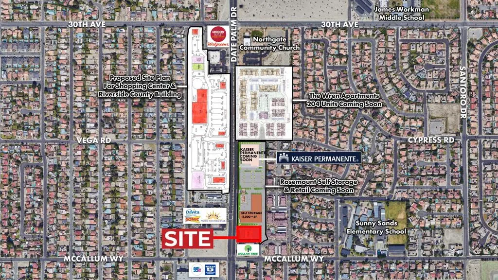 7,000 SF retail/commercial building on .91 acre lot. Impressive traffic counts with 96′ of frontage on Date Palm Dr. Large showroom and one roll-up door. Located at the signalized intersection of Date Palm Dr and McCallum Way. Easy access to Interstate 10 and major arterial roads. Excellent building signage including freestanding pylon signs. Adjacent to Dollar Tree and Rosemount Self Storage and retail center coming soon. In an area of explosive growth, with a 204-unit apartment complex coming soon and a proposed retail center just north of the subject property.