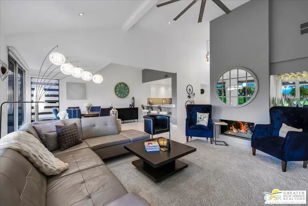 Imagine waking up to sun-drenched mountain vistas on the 6th fairway of Cathedral Canyon’s championship course. This single story 2-bed, 2-bath golf-front gem with a coveted attached 2-car garage is calling you home: no stairs, no neighbors above, just pure desert magic. Step through your spacious private tiled front patio with soft timer lights into vaulted ceilings, skylights, and gleaming white floors flowing through an open floor plan. The beautifully remodeled kitchen showcases Viking appliances, sparkling quartz, custom glossy white cabinetry, and a breakfast bar ready for morning coffee or sunset cocktails. Cozy up to the gas fireplace as natural light pours through a wall of glass leading to your covered rear patio with ceiling fan, recessed lighting, and unobstructed fairway and mountain views, your personal oasis for al fresco dining or stargazing. The primary suite offers a remodeled en-suite bath with a dual vanity and an elegant, spa-inspired tiled shower. The guest bedroom includes a queen Murphy bed and excellent additional storage cabinets ideal for visitors or a comfortable home office. The guest bath is also fully updated with modern finishes and a walk-in shower. Additional upgrades include ceiling fans, custom window coverings, and a newer Samsung washer and dryer. The attached garage features an epoxy floor, built-in cabinetry, and a second-story loft for extra storage. A short stroll takes you to one of the community’s sparkling pools and spas within this secure, gated enclave. HOA includes Wi-Fi, basic cable, trash, sewer, exterior maintenance, roofing, landscaping, and access to six pools and spas. This isn’t just a condo, it’s your desert retreat come to life.