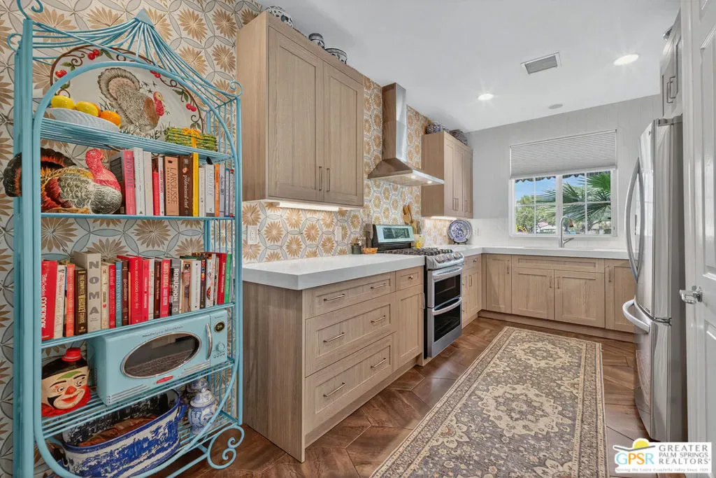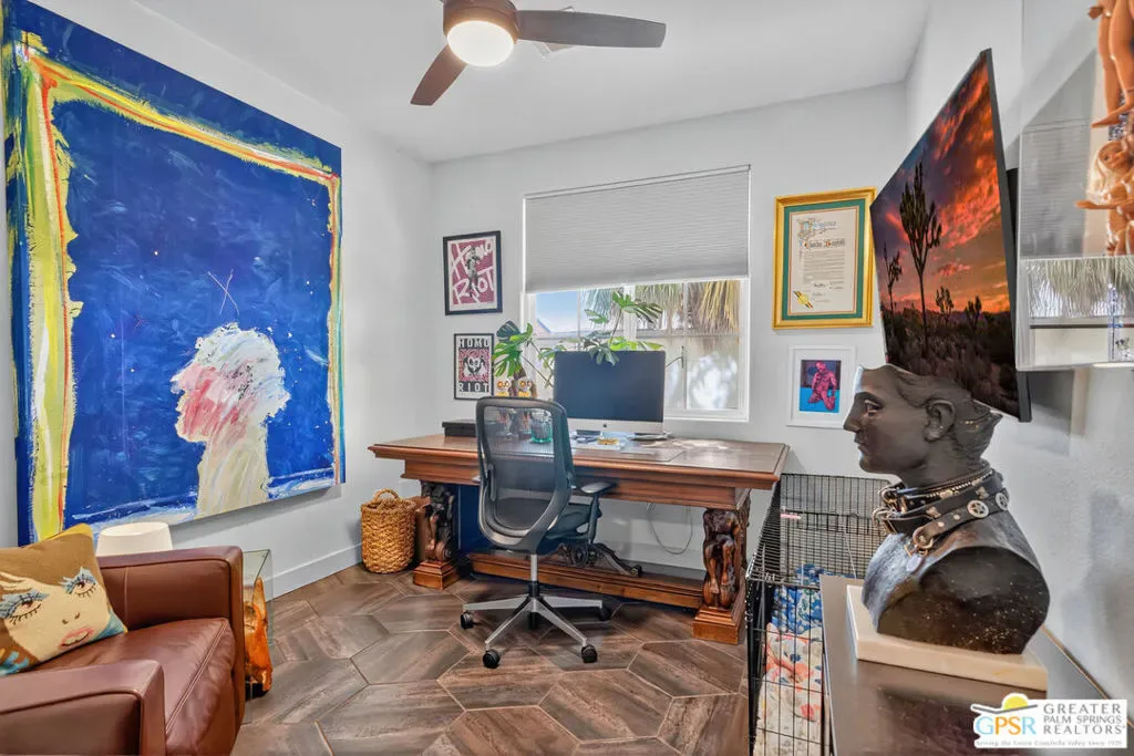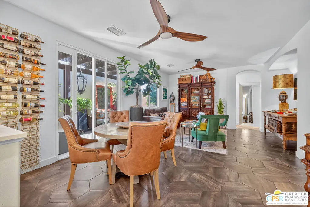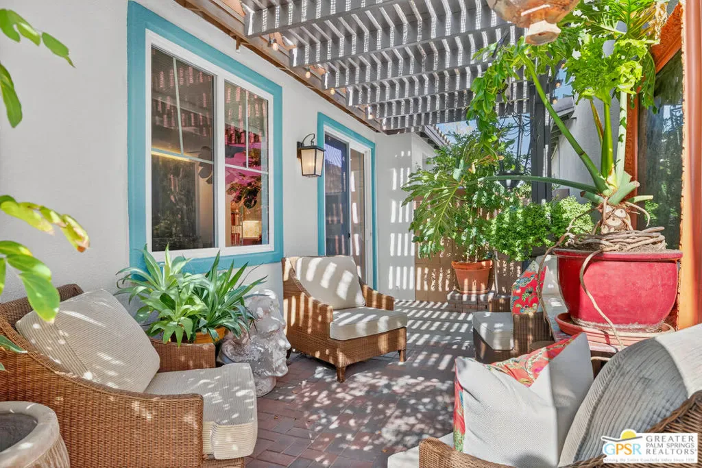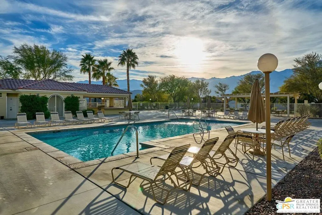 Welcome to Cimarron Cove, an idyllic gated community at the western edge of Cathedral City. This home is one of the most charming in the development with 3 bedrooms, 2 baths, updated kitchen and appliances, and anexceptional floor plan. OWNED SOLAR WITH BACK-UP BATTERY! A single story home, this is one of the smaller of the floor plans, but is extremely well appointed with many value add upgrades throughout. New HVAC, water heater, and AC.Beautiful new front landscaping welcomes you with a graceful path, to the quaint front door. Once inside, you will immediately be enticed by expansive stone tile flooring throughout, a completely redone and upgraded kitchen with artisan tilebacksplash to the ceiling. And, again, a fully paid for solar with back up battery. Graceful rooms open to a lovely back and side yard with newer built pergolas, just waiting for your landscape projects. (See the last of the photos, there is a plan forthe backyard- just waiting for you to dig in!) Must be seen to be believed. Ready to move right in and settle. This home is obviously loved and cared for. Perfectly positioned within Cimarron Cove across from the park, community pool and spa,BBQs, and more! Enjoy your morning coffee with the most spectacular mountain views, right from your kitchen window.