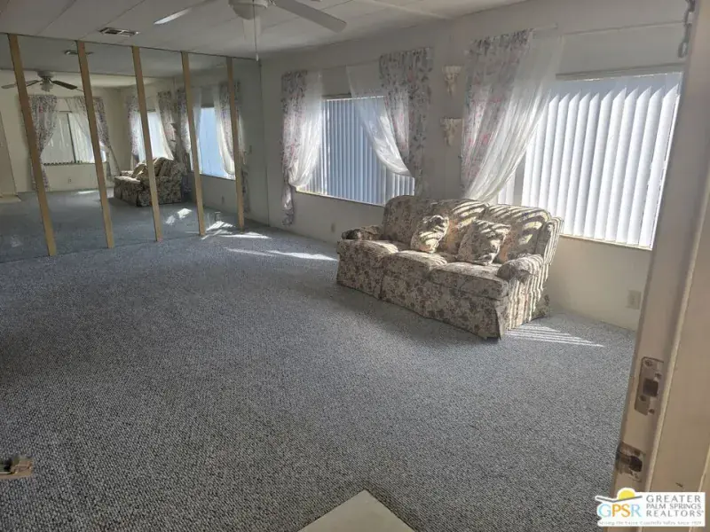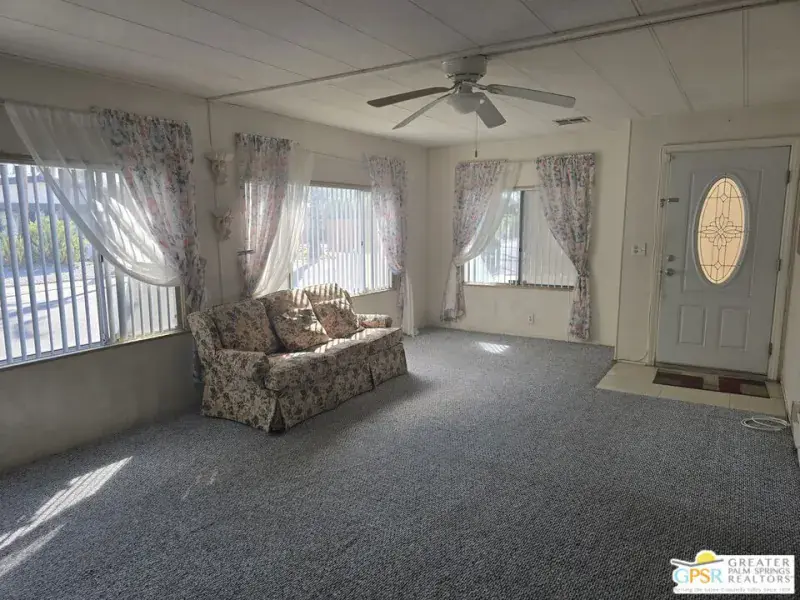 One of the LOWEST PRICED HOMES in Date Palm CC!! Calling all Investors/Flippers/Home Buyer with Contracting experience—here’s a special 2 bed/2 bath double wide (1440 sq) mobile home in this premier 55+ rent space golf community. This home is ready to be re-imagined. Some features of his home include a good sized LR/Dining Area, an open kitchen to the Family Room with Wet Bar, walk-in Closets in both bedrooms, a nice walk-in shower in Primary Bathroom, a dedicated inside Laundry Area housing Washer/Dryer Units. The flooring is a mix of carpeting and tiling. There are 2 outside sheds in 2 car tandem carport plus a area in back of house that can be re-imagined as an outdoor patio setting with mountain views to enjoy. This is a unique opportunity to make this home an updated second or primary home in a fabulous country club setting of golf, tennis/pickleball, onsite restaurant…and MORE. Seller is MOTIVATED. Come See. Make Offer!!