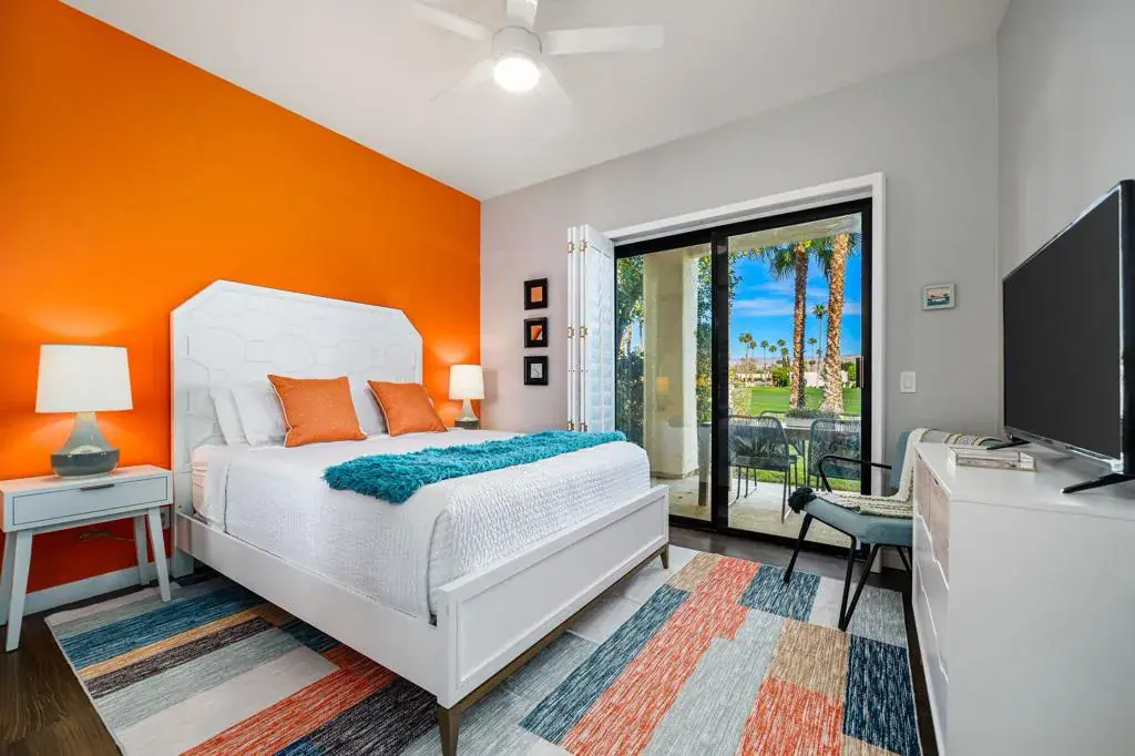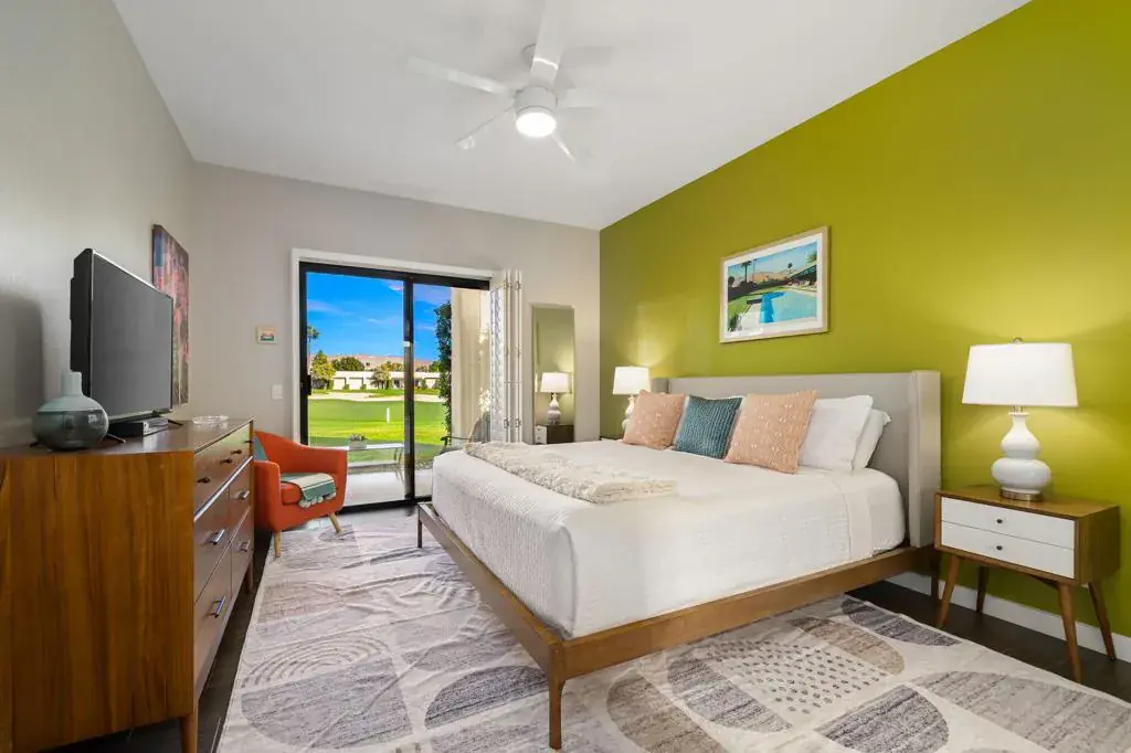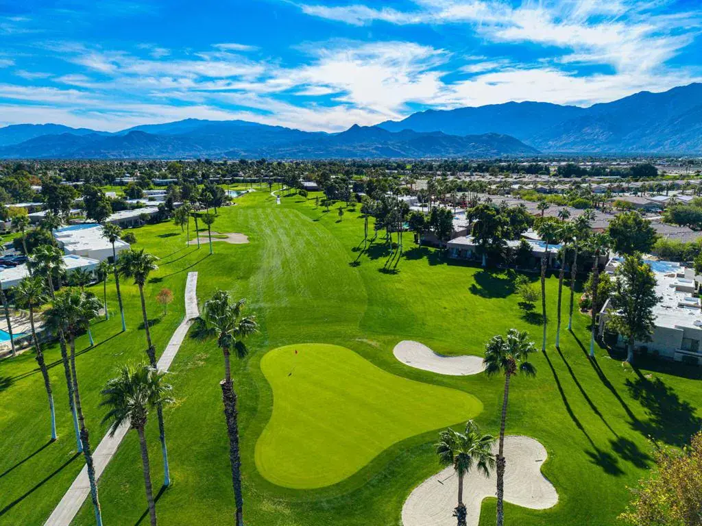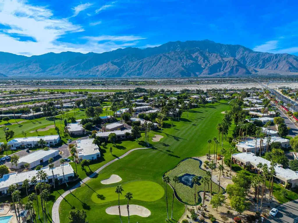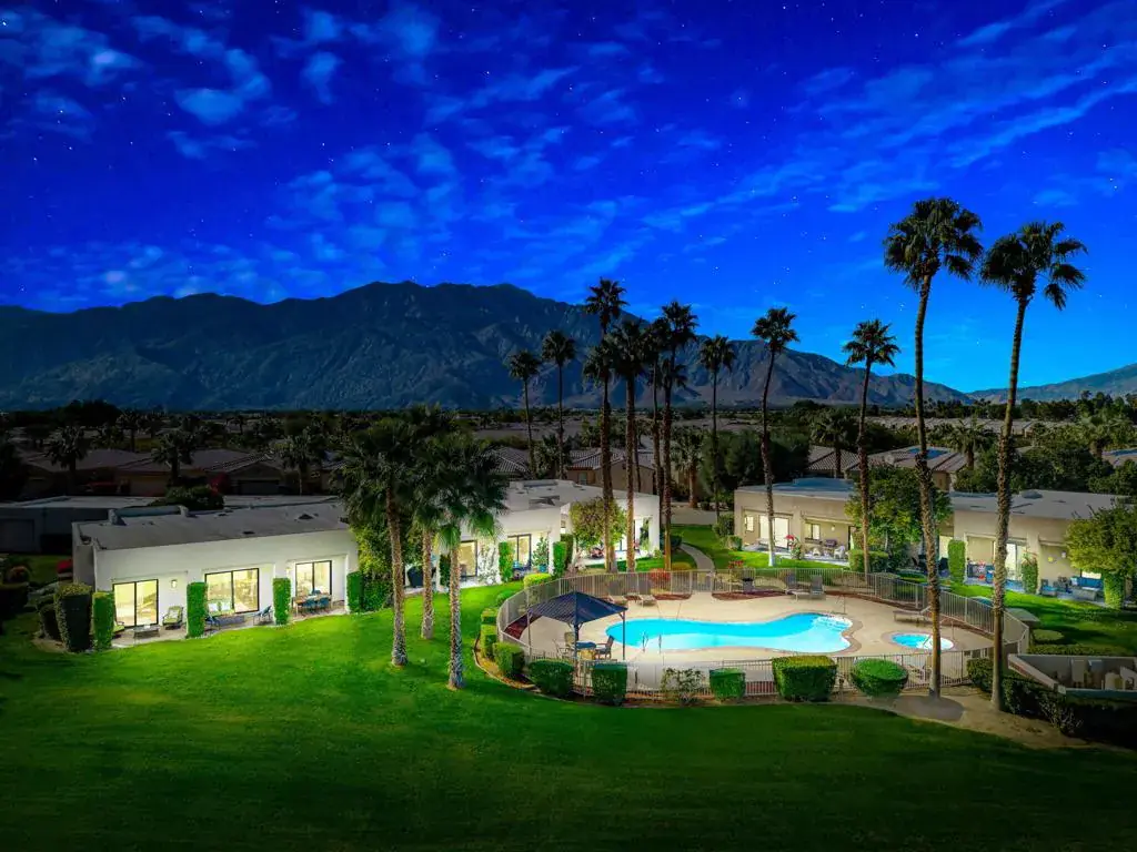 Welcome to Fiesta Siesta–a turnkey, fully furnished, beautifully renovated end-unit condo in the guard-gated Desert Princess Resort! Tucked into a quiet enclave, this home overlooks the golf course and is steps from a brand-new pool and spa. Offering 1,285 sq ft of single-level living, this retreat features mountain views from every window, 3 bedrooms, 2 bathrooms, a one-car garage plus tandem parking, and a courtyard with Weber grill and golf cart parking. Enter through the cheerful teal door into an open floor plan with 9-ft ceilings, abundant natural light, and tile flooring throughout. Guest rooms are separated from the primary suite for privacy. The living room opens to an expansive outdoor Zen space–ideal for sunsets, alfresco dining, and evenings by the firepit. The kitchen offers quartz countertops, abundant cabinetry, oversized peninsula, pantry, and Whirlpool appliances. Bedrooms are generously sized with large closets and dedicated workspace. Modern smart home features include oven, dishwasher, full-size laundry tower, Ring camera, Nest thermostat, digital door lock, MyQ garage opener, camera and keypad. Land lease extended to 2069. Short-term rentals allowed (3-night minimum). HOA includes cable and Wi-Fi. Minutes to downtown Palm Springs, shopping, casinos, biking trails, and easy highway access. 27 holes of PGA golf, bar & grill, spa, pickleball, tennis, fitness center, bocce, and EV charging. Immaculate and move-in ready–luxury desert living at its finest!